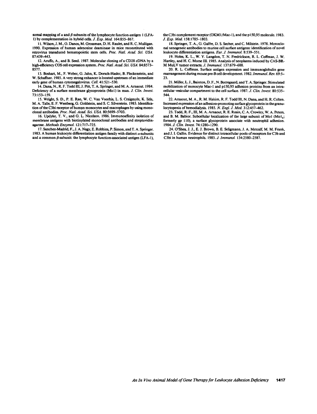 Leukocyte adhesion deficiency (LAD) is an inherited disorder of leukocyte function that is caused by defects in the CD18 gene and is associated with diminished cell surface expression of CD11/CD18 proteins. We have developed an in vivo model for gene therapy of LAD. Recombinant retroviruses were used to transduce a functional human CD18 gene into murine bone marrow cells which were transplanted into lethally irradiated syngeneic recipients. A reliable flow cytometric assay for human CD18 in transplant recipients was developed based on: (a) the availability of human specific CD18 monoclonal antibodies and (b) the observation that human CD18 can form chimeric heterodimers with murine CD11a on the cell surface. Human CD18 was detected on leukocytes in a substantial number of transplant recipients for at least 6 mo suggesting that the gene had been transduced into stem cells. Expression was demonstrated in several lineages of a variety of hematopoietic tissues, but was consistently highest and most frequent in granulocytes. Murine granulocytes demonstrated appropriate posttranscriptional regulation of human CD18 in response to activation of protein kinase C. No apparent untoward effects of human CD18 expression were noted in transplant recipients. These studies suggest a specific strategy for LAD gene therapy that may be effective and safe.