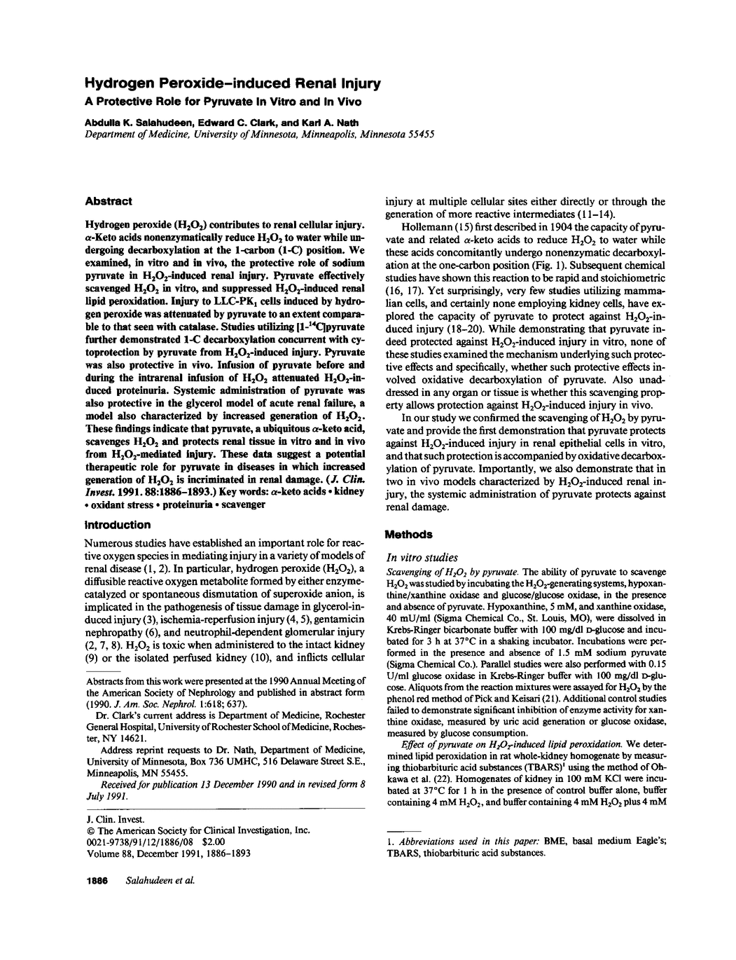 Hydrogen peroxide (H2O2) contributes to renal cellular injury. alpha-Keto acids nonenzymatically reduce H2O2 to water while undergoing decarboxylation at the 1-carbon (1-C) position. We examined, in vitro and in vivo, the protective role of sodium pyruvate in H2O2-induced renal injury. Pyruvate effectively scavenged H2O2 in vitro, and suppressed H2O2-induced renal lipid peroxidation. Injury to LLC-PK1 cells induced by hydrogen peroxide was attenuated by pyruvate to an extent comparable to that seen with catalase. Studies utilizing [1-14C]pyruvate further demonstrated 1-C decarboxylation concurrent with cytoprotection by pyruvate from H2O2-induced injury. Pyruvate was also protective in vivo. Infusion of pyruvate before and during the intrarenal infusion of H2O2 attenuated H2O2-induced proteinuria. Systemic administration of pyruvate was also protective in the glycerol model of acute renal failure, a model also characterized by increased generation of H2O2. These findings indicate that pyruvate, a ubiquitous alpha-keto acid, scavenges H2O2 and protects renal tissue in vitro and in vivo from H2O2-mediated injury. These data suggest a potential therapeutic role for pyruvate in diseases in which increased generation of H2O2 is incriminated in renal damage.