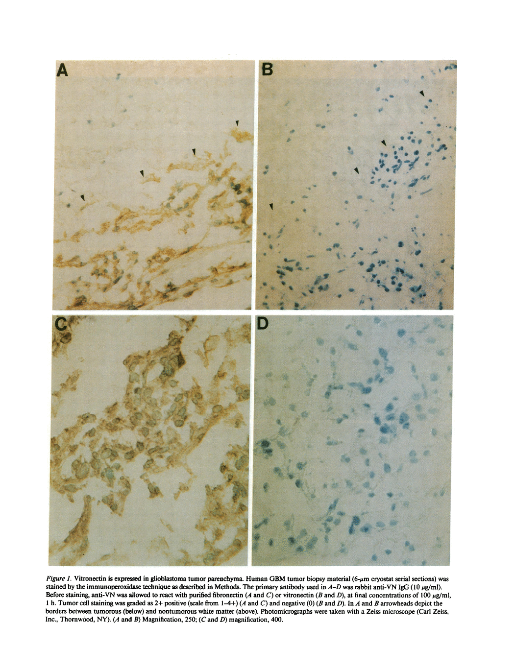 Glioblastoma multiforme, the most malignant astroglial-derived tumor, grows as an adherent mass and locally invades normal brain. An examination of adult cerebral glioblastoma biopsy material for the expression of adhesive proteins that might potentiate adhesion and invasion demonstrated tumor cell-associated vitronectin (5/5). In contrast, vitronectin was not detected associated with glial cells in low grade astroglial tumors (0/4), reactive astrogliosis (0/4), or in normal adult cortex and cerebral white matter (0/5). Also, a wide variety of other adhesive ligands were absent from the glioblastoma tumor parenchyma. The alpha v beta 3 integrin was the only vitronectin receptor identified in glioblastoma tumors in situ, and was also not expressed on low grade astroglial-derived tumors, reactive astrogliosis, or on glia or neurons in normal adult cortex and cerebral white matter. In a cell attachment assay, cultured glioblastoma cells attached to the parenchyma of glioblastoma tumor cryostat sections at the sites of vitronectin expression, but failed to attach to normal brain. This adhesion was inhibited by antibodies directed against vitronectin, the alpha v beta 3 integrin, and with an Arg-Gly-Asp-containing peptide. These data provide evidence for a cell adhesion mechanism in glioblastoma tumors that might potentiate glioblastoma cell invasion of normal brain.
