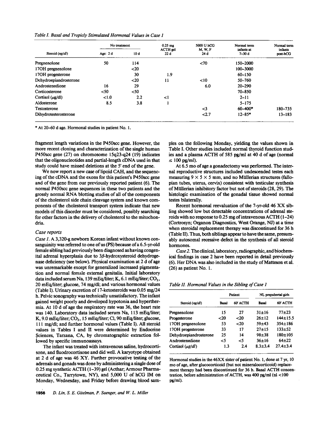 Congenital lipoid adrenal hyperplasia is the most severe form of congenital adrenal hyperplasia. Affected individuals can synthesize no steroid hormones, and hence are all phenotypic females with a severe salt-losing syndrome that is fatal if not treated in early infancy. All previous studies have suggested that the disorder is in the cholesterol side chain cleavage enzyme (P450scc), which converts cholesterol to pregnenolone. A newborn patient was diagnosed by the lack of significant concentrations of adrenal or gonadal steroids either before or after stimulation with corticotropin (ACTH) or gonadotropin (hCG). The P450scc gene in this patient and in a previously described patient were grossly intact, as evidenced by Southern blotting patterns. Enzymatic (polymerase chain reaction) amplification and sequencing of the coding regions of their P450scc genes showed these were identical to the previously cloned human P450scc cDNA and gene sequences. Undetected compound heterozygosity was ruled out in the new patient by sequencing P450scc cDNA enzymatically amplified from gonadal RNA. Northern blots of gonadal RNA from this patient contained normal sized mRNAs for P450scc and also for adrenodoxin reductase, adrenodoxin, sterol carrier protein 2, endozepine, and GRP-78 (the precursor to steroidogenesis activator peptide). These studies show that lipoid CAH is not caused by lesions in the P450scc gene, and suggest that another unidentified factor is required for the conversion of cholesterol to pregnenolone, and is disordered in congenital lipoid adrenal hyperplasia.