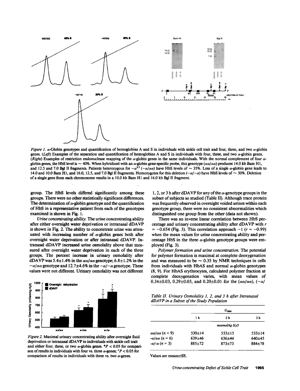 A defect in urine concentrating ability occurs in individuals with sickle cell trait (HbAS). This may result from intracellular polymerization of sickle hemoglobin (HbS) in erythrocytes, leading to microvascular occlusion, in the vasa recta of the renal medulla. To test the hypothesis that the severity of the concentrating defect is related to the percentage of sickle hemoglobin present in erythrocytes, urinary concentrating ability was examined after overnight water deprivation, and intranasal desmopressin acetate (dDAVP) in 27 individuals with HbAS. The HbAS individuals were separated into those who had a normal alpha-globin genotype (alpha alpha/alpha alpha), and those who were either heterozygous (-alpha/alpha alpha) or homozygous (-alpha/-alpha) for gene-deletion alpha-thalassemia, because alpha-thalassemia modulates the HbS concentration in HbAS. The urinary concentrating ability was less in the alpha alpha/alpha alpha genotype than in the -alpha/alpha alpha or -alpha/-alpha genotypes (P less than 0.05). After dDAVP, the urine osmolality was greater in patients with the -alpha/-alpha genotype than with the -alpha/alpha alpha genotype (882 +/- 37 vs. 672 +/- 38 mOsm/kg H2O) (P less than 0.05); patients with the -alpha/alpha alpha genotype had greater concentrating ability than individuals with a normal alpha-globin gene arrangement. There was an inverse linear correlation between urinary osmolality after dDAVP and the percentage HbS in all patients studied (r = -0.654; P less than 0.05). A linear correlation also existed for urine concentrating ability and the calculated polymerization tendencies for an oxygen saturation of 0.4 and O (r = -0.62 and 0.69, respectively). We conclude that the severity of hyposthenuria in HbAS is heterogeneous. It is determined by the amount of HbS polymer, that in turn is dependent upon the percentage HbS, which is itself related to the alpha-globin genotype.