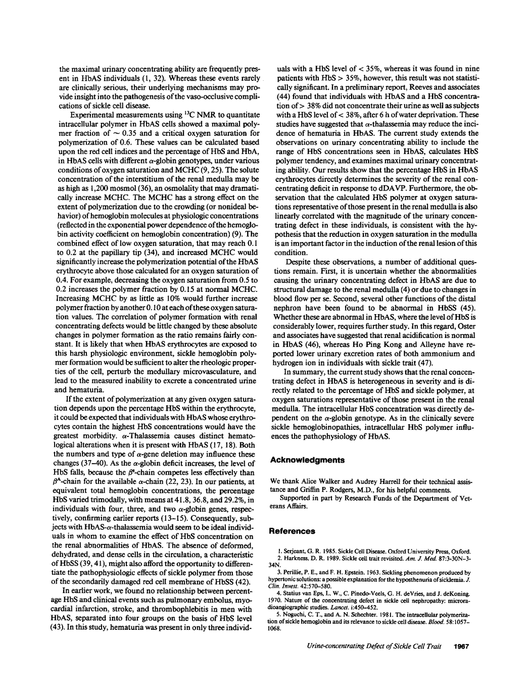 A defect in urine concentrating ability occurs in individuals with sickle cell trait (HbAS). This may result from intracellular polymerization of sickle hemoglobin (HbS) in erythrocytes, leading to microvascular occlusion, in the vasa recta of the renal medulla. To test the hypothesis that the severity of the concentrating defect is related to the percentage of sickle hemoglobin present in erythrocytes, urinary concentrating ability was examined after overnight water deprivation, and intranasal desmopressin acetate (dDAVP) in 27 individuals with HbAS. The HbAS individuals were separated into those who had a normal alpha-globin genotype (alpha alpha/alpha alpha), and those who were either heterozygous (-alpha/alpha alpha) or homozygous (-alpha/-alpha) for gene-deletion alpha-thalassemia, because alpha-thalassemia modulates the HbS concentration in HbAS. The urinary concentrating ability was less in the alpha alpha/alpha alpha genotype than in the -alpha/alpha alpha or -alpha/-alpha genotypes (P less than 0.05). After dDAVP, the urine osmolality was greater in patients with the -alpha/-alpha genotype than with the -alpha/alpha alpha genotype (882 +/- 37 vs. 672 +/- 38 mOsm/kg H2O) (P less than 0.05); patients with the -alpha/alpha alpha genotype had greater concentrating ability than individuals with a normal alpha-globin gene arrangement. There was an inverse linear correlation between urinary osmolality after dDAVP and the percentage HbS in all patients studied (r = -0.654; P less than 0.05). A linear correlation also existed for urine concentrating ability and the calculated polymerization tendencies for an oxygen saturation of 0.4 and O (r = -0.62 and 0.69, respectively). We conclude that the severity of hyposthenuria in HbAS is heterogeneous. It is determined by the amount of HbS polymer, that in turn is dependent upon the percentage HbS, which is itself related to the alpha-globin genotype.