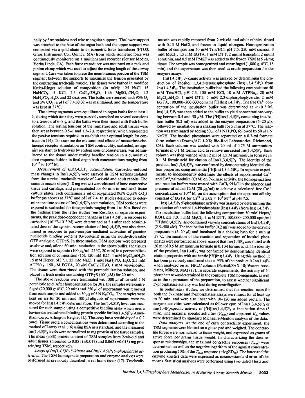 Airway reactivity has been shown to vary with age; however, the mechanism(s) underlying this process remain unidentified. To elucidate the role of ontogenetic changes in phosphoinositide-linked signal transduction, we examined whether age-related differences in tracheal smooth muscle (TSM) contractility to carbachol (CCh) are associated with developmental changes in the production and metabolism of the second messenger, inositol 1,4,5-trisphosphate (Ins (1,4,5)P3). In TSM segments isolated from 2-wk-old and adult rabbits, both the maximal isometric contractile force and sensitivity (i.e., -logED50) to CCh (10(-10)-10(-4) M) were significantly greater in the immature vs. adult tissues (P less than 0.001). Similarly, Ins(1,4,5)P3 accumulation elicited by either receptor-coupled stimulation with CCh (10(-10)-10(-4) M) or post-receptor-mediated guanine nucleotide binding protein activation of permeabilized TSM with GTP gamma S (100 microM) was also significantly enhanced in 2-wk-old vs. adult TSM. Measurement of the activities of the degradative enzymes for Ins(1,4,5)P3 demonstrated that: (a) mean +/- SE maximal Ins(1,4,5)P3 3'-kinase activity was significantly reduced in the immature vs. adult TSM (i.e., approximately 71.7 +/- 6.0 vs. 137.8 +/- 10.0 pmol/min per mg protein, respectively; P less than 0.005); (b) by contrast, maximal Ins(1,4,5)P3 5'-phosphatase activity was significantly increased in the immature vs. adult TSM (i.e., 27.9 +/- 1.2 vs. 15.6 +/- 1.5 nmol/min per mg protein, respectively; P less than 0.001); and (c) the Km values for Ins(1,4,5)P3 5'-phosphatase were 14- and 19-fold greater than those for Ins(1,4,5)P3 3'-kinase in the 2-wk-old and adult TSM, respectively. Collectively, the findings suggest that the age-related decrease in agonist-induced rabbit TSM contractility is associated with a diminution in Ins(1,4,5)P3 accumulation which is attributed, at least in part, to ontogenetic changes in the relative activities of the degradative enzymes for Ins(1,4,5)P3.