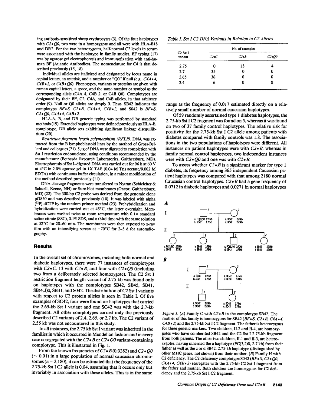 There are three common C2 protein alleles in caucasians, C2*C, C2*B, and C2*Q0, with allele frequencies of 0.96, 0.03, and 0.01, as well as Sst I RFLP variants of 2.75, 2.7, 2.65, 2.55, and 2.4 kb, with frequencies of 0.017, 0.533, 0.358, 0.017, and 0.075. Thus, C2*C is informatively split by the RFLP. Of 94 nonrandomly ascertained caucasian complotypes, 77 contained C2*C, four contained C2*Q0, and 13 had C2*B. None of the C2*C-containing complotypes carried the 2.75 kb Sst I fragment and all of the complotypes with C2*B or C2*Q0 carried it. All of the C2*Q0 alleles were associated with C4A*4, C4B*2 in the complotype S042 as previously reported. C2*B was usually (9/13) in the complotype SB42, occasionally (1/13 each) in SB45, SB41, SB(4,3)0, and SB31. Thus, the association of the C2 2.75-kb fragment was with C2*B and C2*Q0, not with C4A*4, C4B*2, or even C4A*4 alone. The complotype SC42 was associated with the 2.65-kb Sst I fragment in four of five instances and in a single example with the 2.7-kb fragment. C2*B and C2*Q0 possibly had a common evolutionary ancestor complotype which carried the 2.75-kb Sst I fragment, and BF*S, C4A*4, and C4B*2. C2*B (particularly as the haplotype HLA-Bw62, SB42, DR4) is associated with type 1 diabetes but C2*Q0 is protective.
