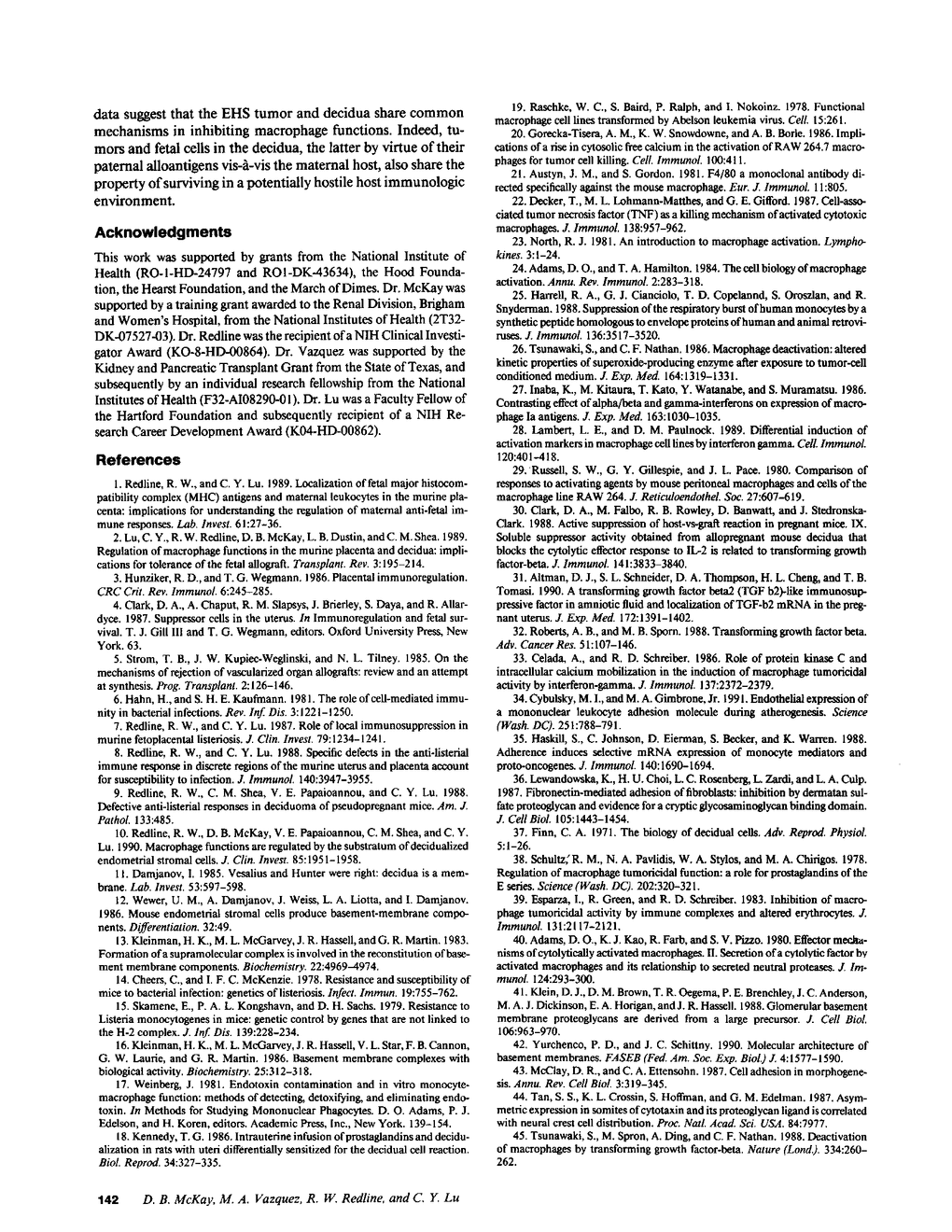 Because of their paternal antigens, the fetus and placenta may be considered an allograft in the maternal host. Understanding the mechanisms which prevent maternal immunological rejection of the fetus remains a fundamental unsolved problem in immunology. We have previously reported that macrophages are inhibited by maternal decidual stromal cells residing at the maternal-fetal interface. In view of the central role of macrophages in cell-mediated immunity, this inhibition may contribute to preventing maternal antifetal responses. We now report that it was the solid phase signals embedded in the extracellular matrix (ECM) made by decidual cells which are responsible for inhibiting macrophage-mediated lysis of TNF-alpha-resistant P815 mastocytoma cells. The latter macrophage function is acquired after stimulation by interferon gamma and endotoxin. All these macrophage functions were also inhibited by ECM isolated from the Engelberth-Holm-Swarme (EHS) tumor. This tumor ECM has a similar biochemical composition to decidual ECM. This ECM inhibited the effector, as opposed to the stimulator, phase of macrophage-mediated tumor lysis. Laminin, type IV collagen, and heparan sulfate proteoglycans, the major known components of decidual and EHS ECMs, did not inhibit the above macrophage functions. Altogether these data indicate that macrophages were inhibited by solid phase signals embedded in decidual and EHS ECMs. Whether the solid phase signals in these two ECMs are biochemically identical remains to be determined. To our knowledge, such signals are a novel pathway of inhibiting macrophage functions which may be important in understanding the maternal-fetal immunologic relationship, and the pathogenesis of perinatal infections. Furthermore, the ability of EHS tumor ECM to inhibit macrophage functions may indicate that some tumors may defend themselves against host macrophage responses using solid phase signals. This may be important in understanding some host-tumor relationships.