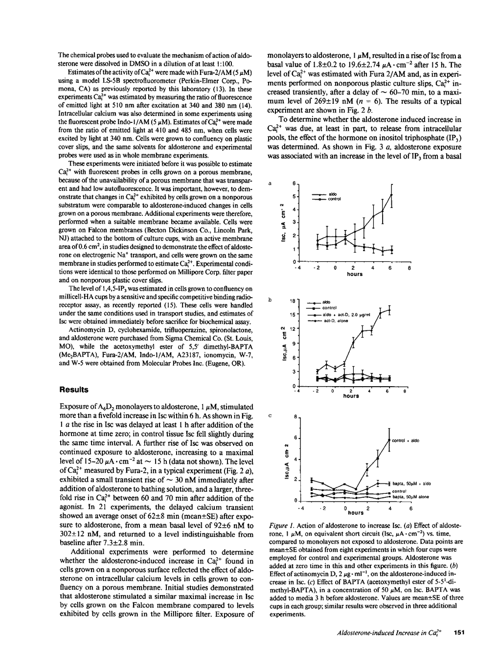 Studies were performed on monolayers of cultured A6 cells, grown on permeable filters, to determine the second messenger system involved in the aldosterone-induced increase in electrogenic sodium transport. Addition of aldosterone (1 microM) to the solution bathing the basal surface of cells caused both an increase in Isc and threefold transient rise in intracellular calcium Cai2+ after a delay of approximately 60 min. Because both events were inhibited by actinomycin D and cyclohexamide, they appeared to require transcriptional and translational processes. Addition of BAPTA to the bathing media to chelate Cai2+ reduced Isc and the delayed Cai2+ transient; 50 microM BAPTA inhibited Isc and the rise in Cai2+ by greater than 80%. Further studies suggested that the action of aldosterone to increase Isc may be dependent on a calcium/calmodulin-dependent protein kinase, because W-7 and trifluoperazine reduced the aldosterone-induced Isc in a dose-dependent manner. Taken together, these observations suggest that calcium is a second messenger for the action of aldosterone on sodium transport, and suggest, for the first time, that agonists which bind to intracellular receptors can utilize, via delayed processes dependent on de novo transcription and translation, intracellular second messenger systems to regulate target cell function.