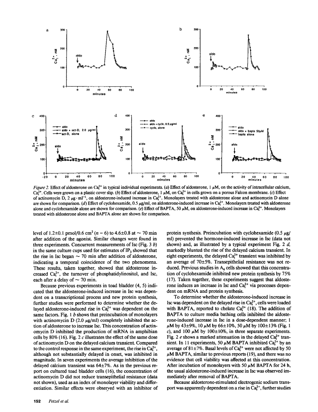 Studies were performed on monolayers of cultured A6 cells, grown on permeable filters, to determine the second messenger system involved in the aldosterone-induced increase in electrogenic sodium transport. Addition of aldosterone (1 microM) to the solution bathing the basal surface of cells caused both an increase in Isc and threefold transient rise in intracellular calcium Cai2+ after a delay of approximately 60 min. Because both events were inhibited by actinomycin D and cyclohexamide, they appeared to require transcriptional and translational processes. Addition of BAPTA to the bathing media to chelate Cai2+ reduced Isc and the delayed Cai2+ transient; 50 microM BAPTA inhibited Isc and the rise in Cai2+ by greater than 80%. Further studies suggested that the action of aldosterone to increase Isc may be dependent on a calcium/calmodulin-dependent protein kinase, because W-7 and trifluoperazine reduced the aldosterone-induced Isc in a dose-dependent manner. Taken together, these observations suggest that calcium is a second messenger for the action of aldosterone on sodium transport, and suggest, for the first time, that agonists which bind to intracellular receptors can utilize, via delayed processes dependent on de novo transcription and translation, intracellular second messenger systems to regulate target cell function.