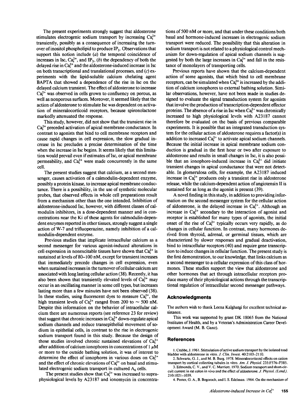 Studies were performed on monolayers of cultured A6 cells, grown on permeable filters, to determine the second messenger system involved in the aldosterone-induced increase in electrogenic sodium transport. Addition of aldosterone (1 microM) to the solution bathing the basal surface of cells caused both an increase in Isc and threefold transient rise in intracellular calcium Cai2+ after a delay of approximately 60 min. Because both events were inhibited by actinomycin D and cyclohexamide, they appeared to require transcriptional and translational processes. Addition of BAPTA to the bathing media to chelate Cai2+ reduced Isc and the delayed Cai2+ transient; 50 microM BAPTA inhibited Isc and the rise in Cai2+ by greater than 80%. Further studies suggested that the action of aldosterone to increase Isc may be dependent on a calcium/calmodulin-dependent protein kinase, because W-7 and trifluoperazine reduced the aldosterone-induced Isc in a dose-dependent manner. Taken together, these observations suggest that calcium is a second messenger for the action of aldosterone on sodium transport, and suggest, for the first time, that agonists which bind to intracellular receptors can utilize, via delayed processes dependent on de novo transcription and translation, intracellular second messenger systems to regulate target cell function.
