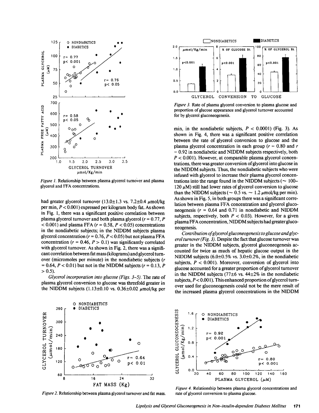 The present studies were undertaken to determine whether lipolysis was increased in non-insulin-dependent diabetes mellitus (NIDDM) and, if so, to assess the influence of increased glycerol availability on its conversion to glucose and its contribution to the increased gluconeogenesis found in this condition. For this purpose, we infused nine subjects with NIDDM and 16 age-, weight-matched nondiabetic volunteers with [2-3H] glucose and [U-14C] glycerol and measured their rates of glucose and glycerol appearance in plasma and their rates of glycerol incorporation into plasma glucose. The rate of glycerol appearance, an index of lipolysis, was increased 1.5-fold in NIDDM subjects (2.85 +/- 0.16 vs. 1.62 +/- 0.08 mumol/kg per min, P less than 0.001). Glycerol incorporation into plasma glucose was increased threefold in NIDDM subjects (1.13 +/- 1.10 vs. 0.36 +/- 0.02 mumol/kg per min, P less than 0.01) and accounted for twice as much of hepatic glucose output (6.0 +/- 0.5 vs. 3.0 +/- 0.2%, P less than 0.001). Moreover, the percent of glycerol turnover used for gluconeogenesis (77 +/- 6 vs. 44 +/- 2, P less than 0.001) was increased in NIDDM subjects and, for a given plasma glycerol concentration, glycerol gluconeogenesis was increased more than two-fold. The only experimental variable significantly correlated with the increased glycerol gluconeogenesis after taking glycerol availability into consideration was the plasma free fatty acid concentration (r = 0.80, P less than 0.01). We, therefore, conclude that lipolysis is increased in NIDDM and, although more glycerol is thus available, increased activity of the intrahepatic pathway for conversion of glycerol into glucose, due at least in part to increased plasma free fatty acids, is the predominant mechanism responsible for enhanced glycerol gluconeogenesis. Finally, although gluconeogenesis from glycerol in NIDDM is comparable to that of alanine and about one-fourth that of lactate is terms of overall flux into glucose, glycerol is probably the most important gluconeogenic precursor in NIDDM in terms of adding new carbons to the glucose pool.