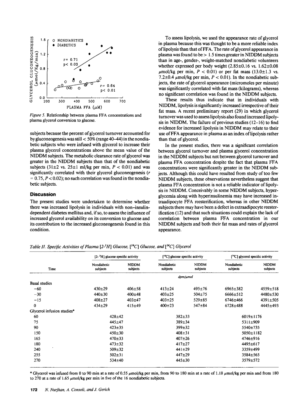 The present studies were undertaken to determine whether lipolysis was increased in non-insulin-dependent diabetes mellitus (NIDDM) and, if so, to assess the influence of increased glycerol availability on its conversion to glucose and its contribution to the increased gluconeogenesis found in this condition. For this purpose, we infused nine subjects with NIDDM and 16 age-, weight-matched nondiabetic volunteers with [2-3H] glucose and [U-14C] glycerol and measured their rates of glucose and glycerol appearance in plasma and their rates of glycerol incorporation into plasma glucose. The rate of glycerol appearance, an index of lipolysis, was increased 1.5-fold in NIDDM subjects (2.85 +/- 0.16 vs. 1.62 +/- 0.08 mumol/kg per min, P less than 0.001). Glycerol incorporation into plasma glucose was increased threefold in NIDDM subjects (1.13 +/- 1.10 vs. 0.36 +/- 0.02 mumol/kg per min, P less than 0.01) and accounted for twice as much of hepatic glucose output (6.0 +/- 0.5 vs. 3.0 +/- 0.2%, P less than 0.001). Moreover, the percent of glycerol turnover used for gluconeogenesis (77 +/- 6 vs. 44 +/- 2, P less than 0.001) was increased in NIDDM subjects and, for a given plasma glycerol concentration, glycerol gluconeogenesis was increased more than two-fold. The only experimental variable significantly correlated with the increased glycerol gluconeogenesis after taking glycerol availability into consideration was the plasma free fatty acid concentration (r = 0.80, P less than 0.01). We, therefore, conclude that lipolysis is increased in NIDDM and, although more glycerol is thus available, increased activity of the intrahepatic pathway for conversion of glycerol into glucose, due at least in part to increased plasma free fatty acids, is the predominant mechanism responsible for enhanced glycerol gluconeogenesis. Finally, although gluconeogenesis from glycerol in NIDDM is comparable to that of alanine and about one-fourth that of lactate is terms of overall flux into glucose, glycerol is probably the most important gluconeogenic precursor in NIDDM in terms of adding new carbons to the glucose pool.