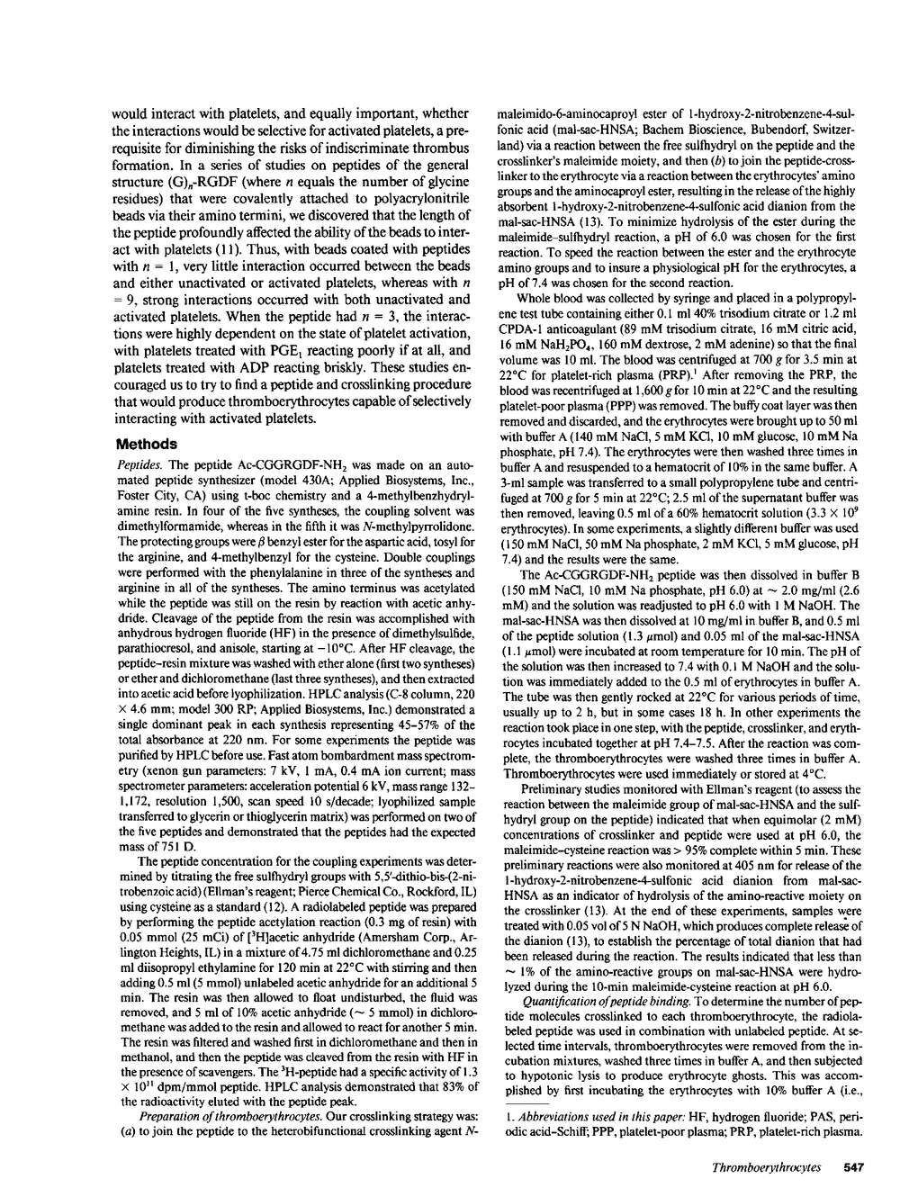 In an attempt to overcome the limitations and drawbacks of using fresh platelets for transfusion therapy of thrombocytopenic patients, we have performed in vitro experiments on an autologous, semi-artificial alternative to platelet transfusions. Based on our previous studies of the interactions of unactivated and activated platelets with beads coated with peptides of various lengths, all of which contained the arginine-glycine-aspartic acid (RGD) cell recognition sequence, the peptide Ac-CGGRGDF-NH2 was chosen for covalent coupling to erythrocytes. A heterobifunctional crosslinking reagent (N-maleimido-6-aminocaproyl ester of 1-hydroxy-2-nitrobenzene-4-sulfonic acid) was used to crosslink via the peptide's free sulfhydryl group and the erythrocyte's surface amino groups. Approximately 0.5-1.5 x 10(6) peptide molecules bound per erythrocyte after 2 h of incubation, and most of the peptides appeared to crosslink to glycophorin A. The resulting cells, termed thromboerythrocytes, interacted selectively with activated platelets to form mixed aggregates. Studies with fluid phase RGD peptides and monoclonal antibodies indicated that the RGD peptides on the thromboerythrocytes interacted with the GPIIb/IIIa receptors on activated platelets. Thromboerythrocytes could also bind to platelets adherent to collagen. There was minimal erythrocyte hemolysis during the formation of thromboerythrocytes and studies of thromboerythrocyte osmotic fragility and cellular deformability showed no significant changes from control erythrocytes. Whereas there is a 20:1 ratio of erythrocytes to platelets in the circulation of normal individuals, the erythrocytes from as little as 50 ml of blood could be transformed into the equivalent of 2 U of platelets by numbers (equivalent to 18 U of platelets by mass), and reinfused into the same individual within several hours. These data encourage us to proceed to in vivo studies to assess the hemostatic efficacy of thromboerythrocytes in thrombocytopenic animals.