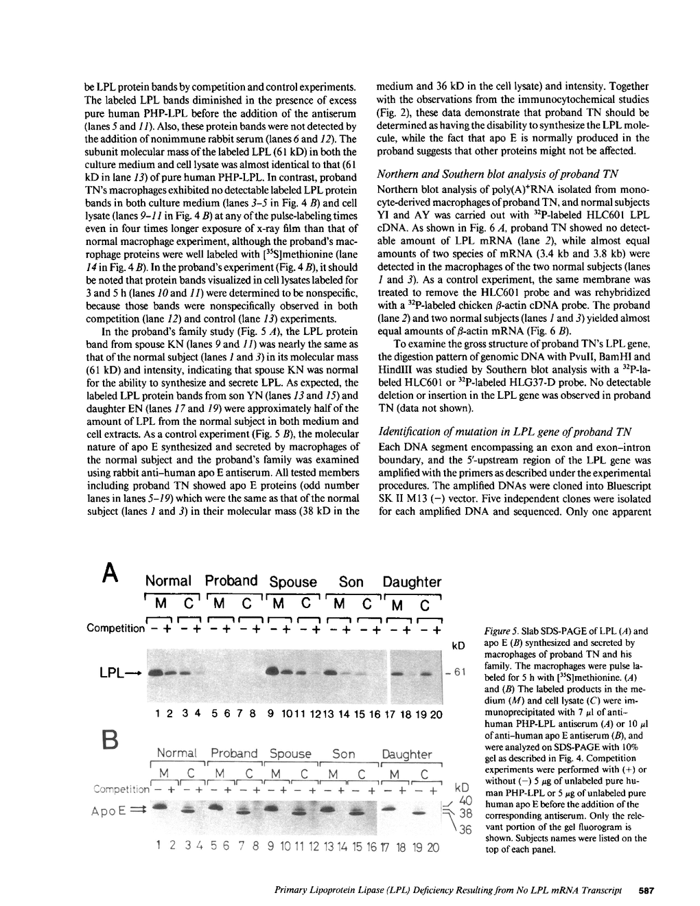 We have systematically investigated a genetic defect resulting in a primary lipoprotein lipase (LPL) deficiency in a proband TN and his affected brother SN, both manifesting familial hyperchylomicronemia. Neither LPL activity nor immunoreactive LPL mass was detected in postheparin plasma from the two patients. Immunocytochemical and biosynthetic studies on the proband's monocyte-derived macrophages with rabbit anti-human LPL antiserum revealed that no immunochemically detectable LPL protein was found in either the cells or culture medium, whereas LPL having a molecular mass of 61 kD was detected in normal cells. No detectable LPL mRNA was identified from poly(A)+RNA of the proband's macrophages by Northern blot analysis, and grossly visible LPL gene rearrangement was not observed by Southern blot analysis. Sequence analysis of polymerase chain reaction-amplified LPL gene exons detected one base deletion of G (first position of Ala221) at base 916 in exon 5 which leads to a premature termination by a frameshift. This mutation, designated as LPLArita and resulting in the loss of an AluI restriction enzyme site, was newly identified. We further analyzed the LPL gene from the two patients and their family members by digestion with AluI. Both patients were homozygous for LPLArita allele, while their spouses did not have this mutation. As genetically expected, their children were all heterozygous for LPLArita. We conclude that primary LPL deficiency in the proband was caused by a lack of enzyme synthesis due to the absence of LPL mRNA resulting from one base deletion of G in exon 5, and that heterozygous LPLArita deficient subjects show almost half value of control LPL mass.