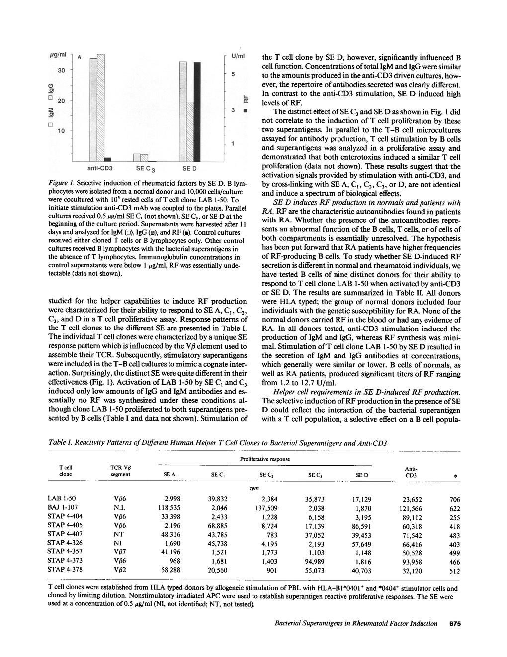 Production of autoantibodies specific for the Fc region of autologous IgG, called rheumatoid factors (RF), is a characteristic finding in patients with rheumatoid arthritis (RA). To study the requirements regulating the synthesis of these autoantibodies, we have cloned human helper T cells and co-cultured them with purified B cells. To mimic cognate T-B cell interaction, we have used bacterial superantigens that function by cross-linking HLA molecules on the B cell with selected T cell receptor (TCR) molecules expressing a particular polymorphism of the V beta gene segment. Data presented here demonstrate that the staphylococcal enterotoxin D (SE D), but not other bacterial superantigens, exhibits an ability to induce IgM, IgG, and especially RF production, in B cells from RA patients and normal individuals. Comparison with the polyclonal antibody production in B cell cultures driven by anti-CD3-stimulated T cell clones confirmed that SE D shifted the repertoire of secreted antibodies toward immunoglobulins with Fc binding specificity, suggesting that SE D preferentially stimulates RF+ B lymphocytes. B cells with the potential to secrete RF were highly frequent in RA patients, requiring as few as 150 peripheral B cells/culture to detect RF in the culture supernatants. SE D-induced RF synthesis was strictly dependent on the presence of selected CD4+T helper cells and required a direct membrane contact between B cells and T helper cells. Here, we propose a model that SE D selectively induces RF production depending on the availability of SE D responsive T cells in the TCR repertoire of the responder.
