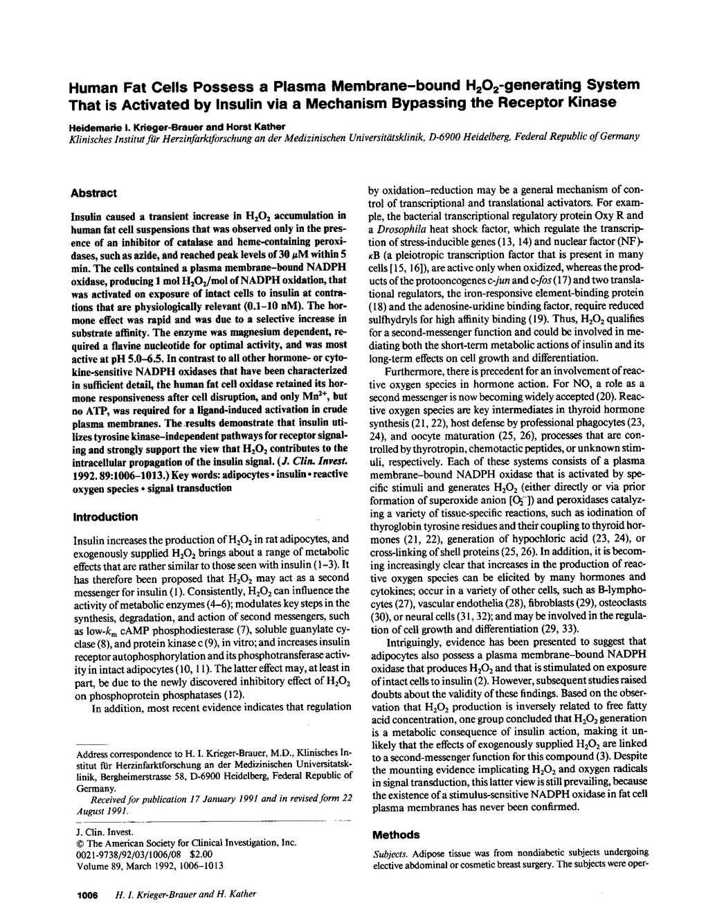 Insulin caused a transient increase in H2O2 accumulation in human fat cell suspensions that was observed only in the presence of an inhibitor of catalase and heme-containing peroxidases, such as azide, and reached peak levels of 30 microM within 5 min. The cells contained a plasma membrane-bound NADPH oxidase, producing 1 mol H2O2/mol of NADPH oxidation, that was activated on exposure of intact cells to insulin at contrations that are physiologically relevant (0.1-10 nM). The hormone effect was rapid and was due to a selective increase in substrate affinity. The enzyme was magnesium dependent, required a flavine nucleotide for optimal activity, and was most active at pH 5.0-6.5. In contrast to all other hormone- or cytokine-sensitive NADPH oxidases that have been characterized in sufficient detail, the human fat cell oxidase retained its hormone responsiveness after cell disruption, and only Mn2+, but no ATP, was required for a ligand-induced activation in crude plasma membranes. The results demonstrate that insulin utilizes tyrosine kinase-independent pathways for receptor signaling and strongly support the view that H2O2 contributes to the intracellular propagation of the insulin signal.
