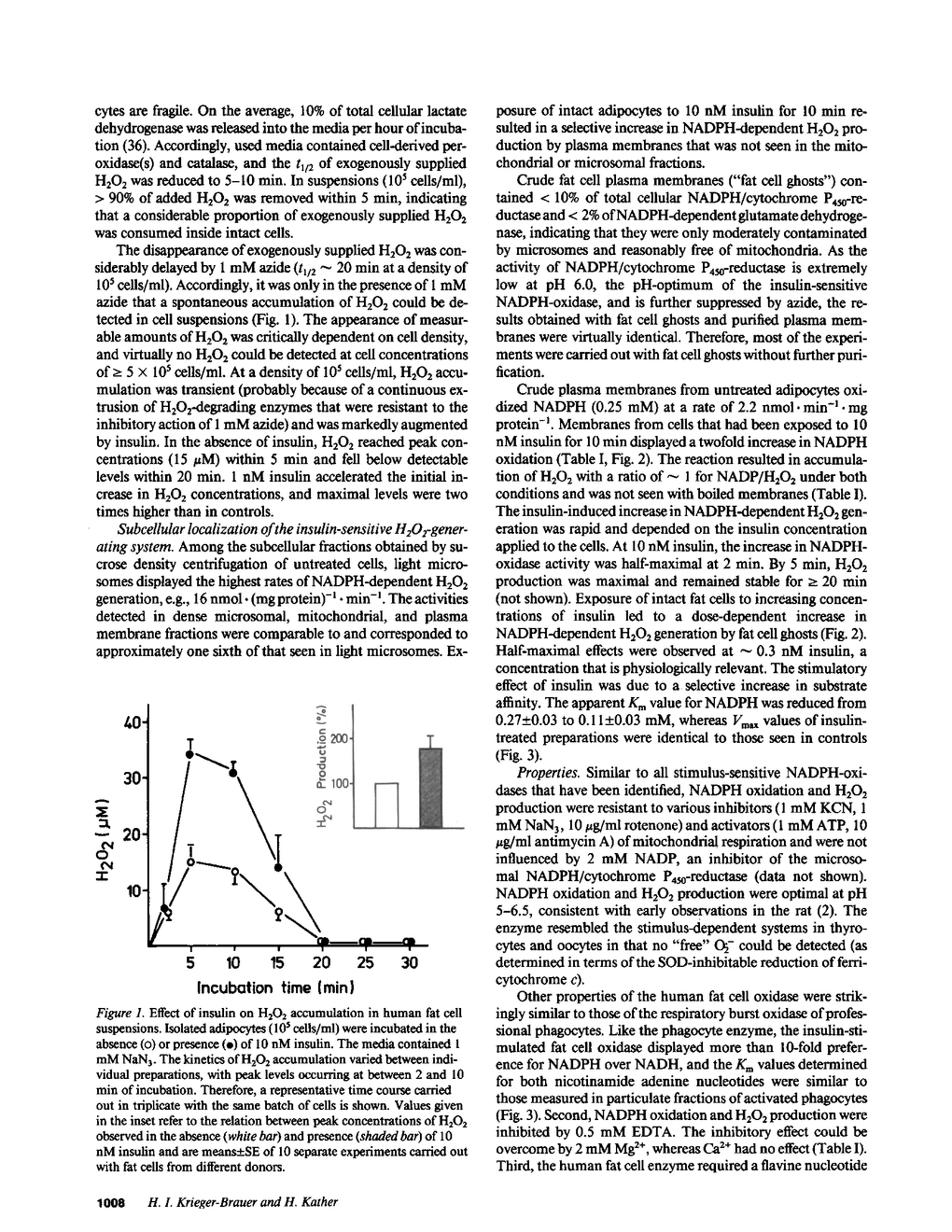 Insulin caused a transient increase in H2O2 accumulation in human fat cell suspensions that was observed only in the presence of an inhibitor of catalase and heme-containing peroxidases, such as azide, and reached peak levels of 30 microM within 5 min. The cells contained a plasma membrane-bound NADPH oxidase, producing 1 mol H2O2/mol of NADPH oxidation, that was activated on exposure of intact cells to insulin at contrations that are physiologically relevant (0.1-10 nM). The hormone effect was rapid and was due to a selective increase in substrate affinity. The enzyme was magnesium dependent, required a flavine nucleotide for optimal activity, and was most active at pH 5.0-6.5. In contrast to all other hormone- or cytokine-sensitive NADPH oxidases that have been characterized in sufficient detail, the human fat cell oxidase retained its hormone responsiveness after cell disruption, and only Mn2+, but no ATP, was required for a ligand-induced activation in crude plasma membranes. The results demonstrate that insulin utilizes tyrosine kinase-independent pathways for receptor signaling and strongly support the view that H2O2 contributes to the intracellular propagation of the insulin signal.