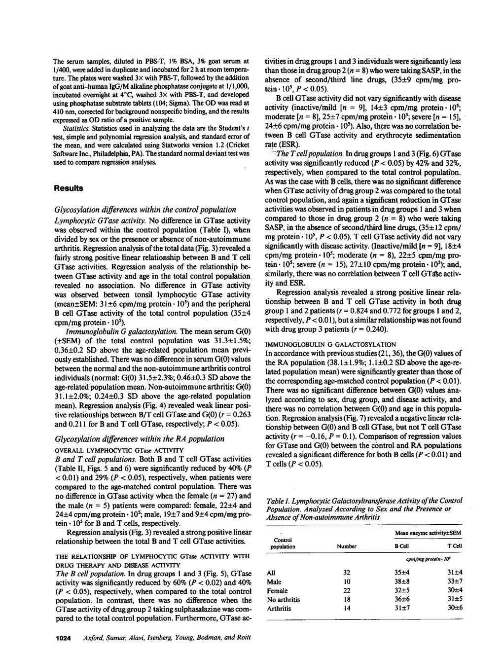 To investigate potential mechanisms controlling protein glycosylation we have studied the interrelationship between lymphocytic galactosyltransferase (GTase) activity and serum agalactosylated immunoglobulin G levels (G(0)) in healthy individuals and patients with rheumatoid arthritis and non-autoimmune arthritis. In RA there was reduced GTase activity and increased G(0). A positive linear correlation between B and T cell GTase was found in all individuals. The relationship between GTase and G(0) was found to be positive and linear in the control population and negative and linear in the RA population. Sulphasalazine therapy maintained normal levels of GTase and caused a reduction in G(0) in the RA population. IgG anti-GTase antibodies (abs) were significantly increased in the RA population, whereas IgM anti-GTase abs were significantly decreased in both the RA and the non-autoimmune arthritis groups. These data describe a defect in RA lymphocytic GTase, with associated abnormal G(0) changes, which is corrected by sulphasalazine. A possible regulatory mechanism controlling galactosylation in normal cells is suggested, in which there is parallel control of B and T cell GTase. IgM anti-GTase abs may be integrated into this normal regulatory process. This is disrupted in RA, where the positive feedback between GTase and G(0) is lost and there is an associated increase in IgG anti-GTase abs, which may result from isotype switching as IgM anti-GTase abs are reduced. We suggest that these mechanisms are of relevance to the pathogenesis of RA, and that their manipulation may form part of a novel therapeutic approach.