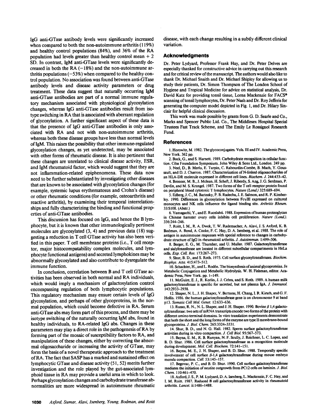 To investigate potential mechanisms controlling protein glycosylation we have studied the interrelationship between lymphocytic galactosyltransferase (GTase) activity and serum agalactosylated immunoglobulin G levels (G(0)) in healthy individuals and patients with rheumatoid arthritis and non-autoimmune arthritis. In RA there was reduced GTase activity and increased G(0). A positive linear correlation between B and T cell GTase was found in all individuals. The relationship between GTase and G(0) was found to be positive and linear in the control population and negative and linear in the RA population. Sulphasalazine therapy maintained normal levels of GTase and caused a reduction in G(0) in the RA population. IgG anti-GTase antibodies (abs) were significantly increased in the RA population, whereas IgM anti-GTase abs were significantly decreased in both the RA and the non-autoimmune arthritis groups. These data describe a defect in RA lymphocytic GTase, with associated abnormal G(0) changes, which is corrected by sulphasalazine. A possible regulatory mechanism controlling galactosylation in normal cells is suggested, in which there is parallel control of B and T cell GTase. IgM anti-GTase abs may be integrated into this normal regulatory process. This is disrupted in RA, where the positive feedback between GTase and G(0) is lost and there is an associated increase in IgG anti-GTase abs, which may result from isotype switching as IgM anti-GTase abs are reduced. We suggest that these mechanisms are of relevance to the pathogenesis of RA, and that their manipulation may form part of a novel therapeutic approach.