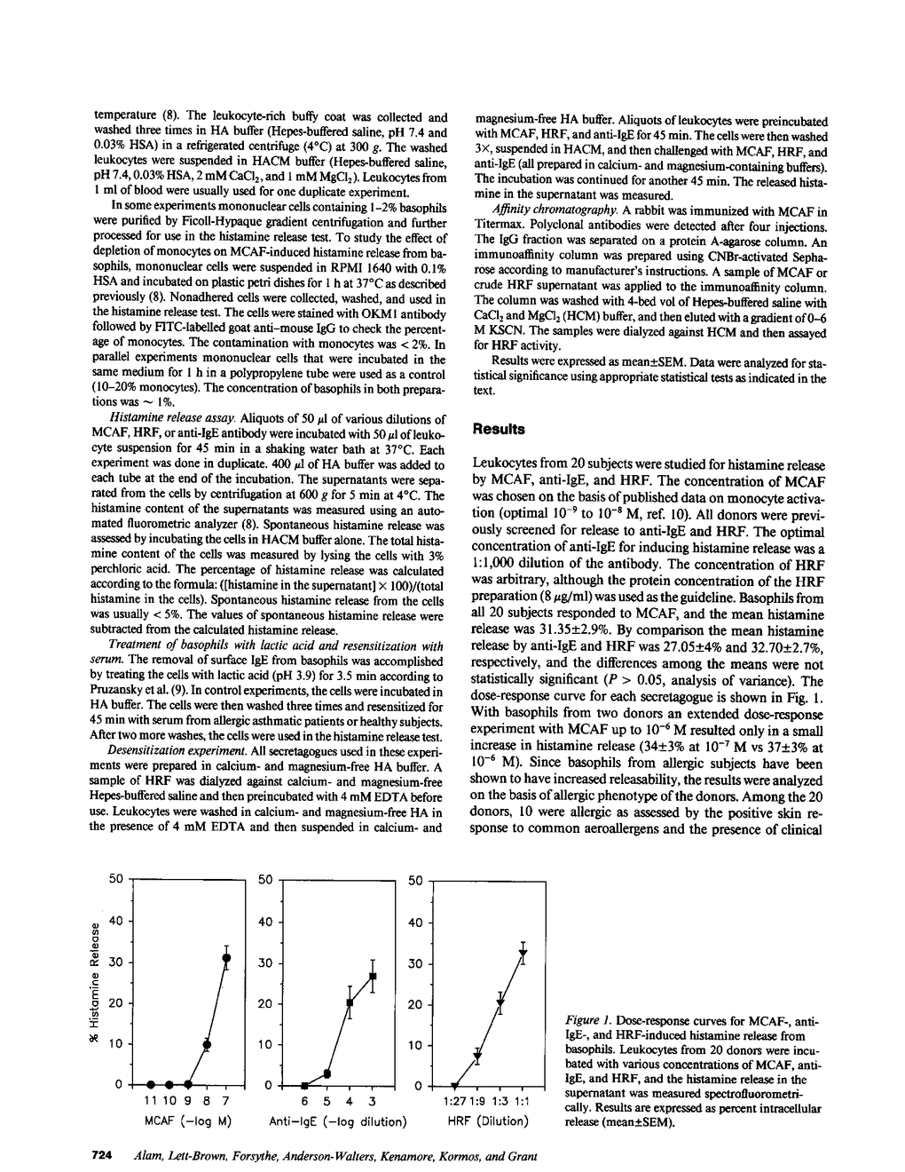Monocyte chemotactic and activating factor (MCAF) is a recently cloned cytokine that causes chemotaxis of basophils. In our pursuit of cytokines affecting basophil function, we studied the effect of MCAF on histamine secretion from basophils. Leukocytes from 20 donors, 10 allergic and 10 normal subjects, were studied. MCAF caused dose-dependent release of histamine at concentrations of 10(-8) and 10(-7) M, and the mean release was 31.25 +/- 2.9% at the highest concentration. In the same experiments the mean histamine release by anti-IgE and histamine releasing factor (HRF) was 27.05 +/- 4% and 32.70 +/- 2.7%, respectively. All 20 subjects responded to MCAF with significant histamine release. Allergic subjects released significantly more histamine than normals in response to anti-IgE (P less than 0.01) but not to MCAF (P = 0.2) and HRF (P = 0.1). The histamine release was significantly correlated between MCAF and HRF (P less than 0.01), but not between MCAF and anti-IgE (P greater than 0.05). The histamine release by MCAF was complete within the first 3 min. MCAF-induced degranulation was a calcium-dependent process. Leukocytes depleted of monocytes responded equally well to MCAF. Using an anti-MCAF affinity column we determined that greater than 50% of HRF activity of crude PBMC supernatant could be attributed to MCAF. Thus, we established that MCAF is a potent secretagogue for basophils.