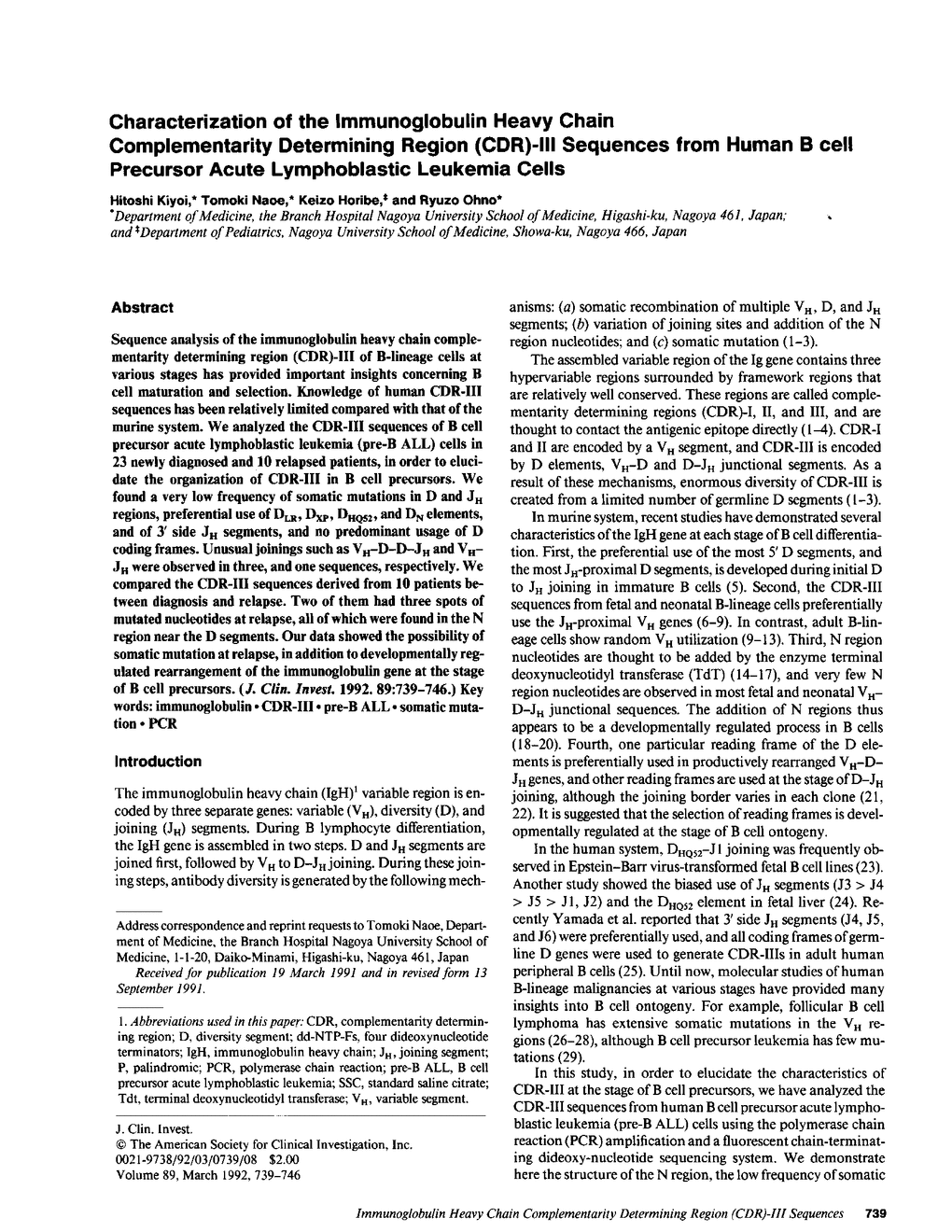 Sequence analysis of the immunoglobulin heavy chain complementarity determining region (CDR)-III of B-lineage cells at various stages has provided important insights concerning B cell maturation and selection. Knowledge of human CDR-III sequences has been relatively limited compared with that of the murine system. We analyzed the CDR-III sequences of B cell precursor acute lymphoblastic leukemia (pre-B ALL) cells in 23 newly diagnosed and 10 relapsed patients, in order to elucidate the organization of CDR-III in B cell precursors. We found a very low frequency of somatic mutations in D and JH regions, preferential use of DLR, DXP, DHQ52, and DN elements, and of 3' side JH segments, and no predominant usage of D coding frames. Unusual joinings such as VH-D-D-JH and VH-JH were observed in three, and one sequences, respectively. We compared the CDR-III sequences derived from 10 patients between diagnosis and relapse. Two of them had three spots of mutated nucleotides at relapse, all of which were found in the N region near the D segments. Our data showed the possibility of somatic mutation at relapse, in addition to developmentally regulated rearrangement of the immunoglobulin gene at the stage of B cell precursors.