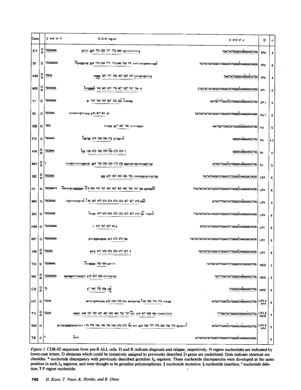 Sequence analysis of the immunoglobulin heavy chain complementarity determining region (CDR)-III of B-lineage cells at various stages has provided important insights concerning B cell maturation and selection. Knowledge of human CDR-III sequences has been relatively limited compared with that of the murine system. We analyzed the CDR-III sequences of B cell precursor acute lymphoblastic leukemia (pre-B ALL) cells in 23 newly diagnosed and 10 relapsed patients, in order to elucidate the organization of CDR-III in B cell precursors. We found a very low frequency of somatic mutations in D and JH regions, preferential use of DLR, DXP, DHQ52, and DN elements, and of 3' side JH segments, and no predominant usage of D coding frames. Unusual joinings such as VH-D-D-JH and VH-JH were observed in three, and one sequences, respectively. We compared the CDR-III sequences derived from 10 patients between diagnosis and relapse. Two of them had three spots of mutated nucleotides at relapse, all of which were found in the N region near the D segments. Our data showed the possibility of somatic mutation at relapse, in addition to developmentally regulated rearrangement of the immunoglobulin gene at the stage of B cell precursors.