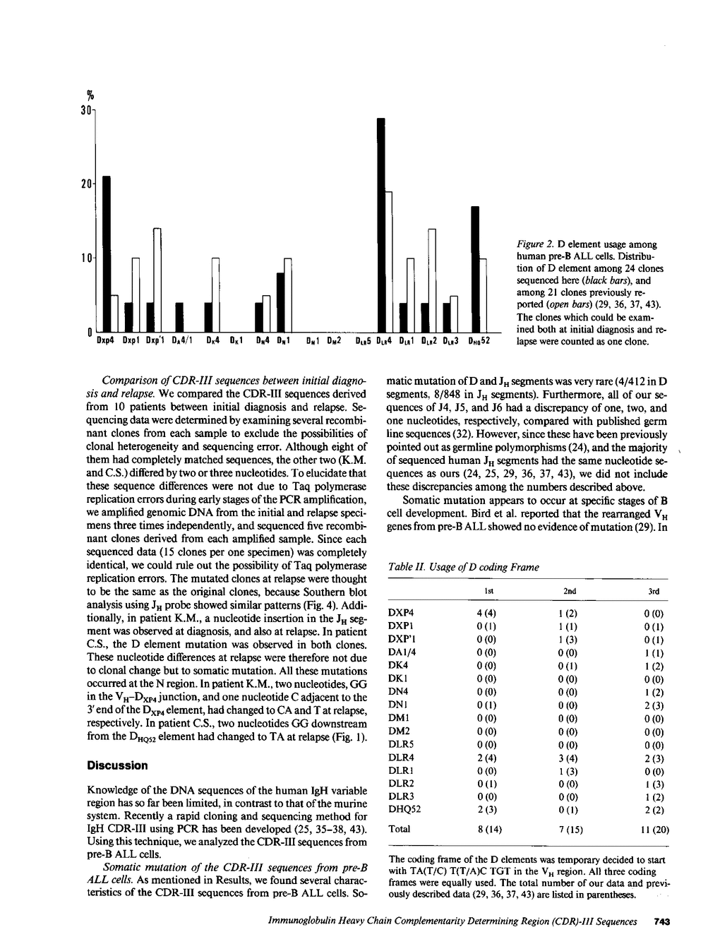 Sequence analysis of the immunoglobulin heavy chain complementarity determining region (CDR)-III of B-lineage cells at various stages has provided important insights concerning B cell maturation and selection. Knowledge of human CDR-III sequences has been relatively limited compared with that of the murine system. We analyzed the CDR-III sequences of B cell precursor acute lymphoblastic leukemia (pre-B ALL) cells in 23 newly diagnosed and 10 relapsed patients, in order to elucidate the organization of CDR-III in B cell precursors. We found a very low frequency of somatic mutations in D and JH regions, preferential use of DLR, DXP, DHQ52, and DN elements, and of 3' side JH segments, and no predominant usage of D coding frames. Unusual joinings such as VH-D-D-JH and VH-JH were observed in three, and one sequences, respectively. We compared the CDR-III sequences derived from 10 patients between diagnosis and relapse. Two of them had three spots of mutated nucleotides at relapse, all of which were found in the N region near the D segments. Our data showed the possibility of somatic mutation at relapse, in addition to developmentally regulated rearrangement of the immunoglobulin gene at the stage of B cell precursors.
