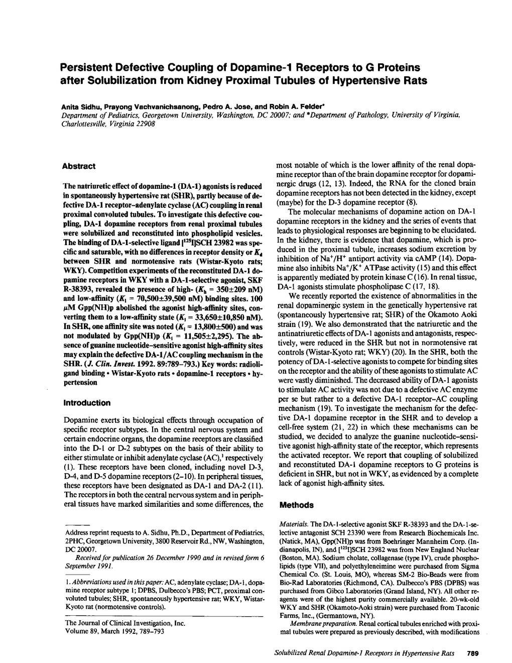 The natriuretic effect of dopamine-1 (DA-1) agonists is reduced in spontaneously hypertensive rat (SHR), partly because of defective DA-1 receptor-adenylate cyclase (AC) coupling in renal proximal convoluted tubules. To investigate this defective coupling, DA-1 dopamine receptors from renal proximal tubules were solubilized and reconstituted into phospholipid vesicles. The binding of DA-1-selective ligand [125I]SCH 23982 was specific and saturable, with no differences in receptor density or Kd between SHR and normotensive rats (Wistar-Kyoto rats; WKY). Competition experiments of the reconstituted DA-1 dopamine receptors in WKY with a DA-1-selective agonist, SKF R-38393, revealed the presence of high- (Kh = 350 +/- 209 nM) and low-affinity (Kl = 70,500 +/- 39,500 nM) binding sites. 100 microM Gpp(NH)p abolished the agonist high-affinity sites, converting them to a low-affinity state (Ki = 33,650 +/- 10,850 nM). In SHR, one affinity site was noted (Ki = 13,800 +/- 500) and was not modulated by Gpp(NH)p (Ki = 11,505 +/- 2,295). The absence of guanine nucleotide-sensitive agonist high-affinity sites may explain the defective DA-1/AC coupling mechanism in the SHR.