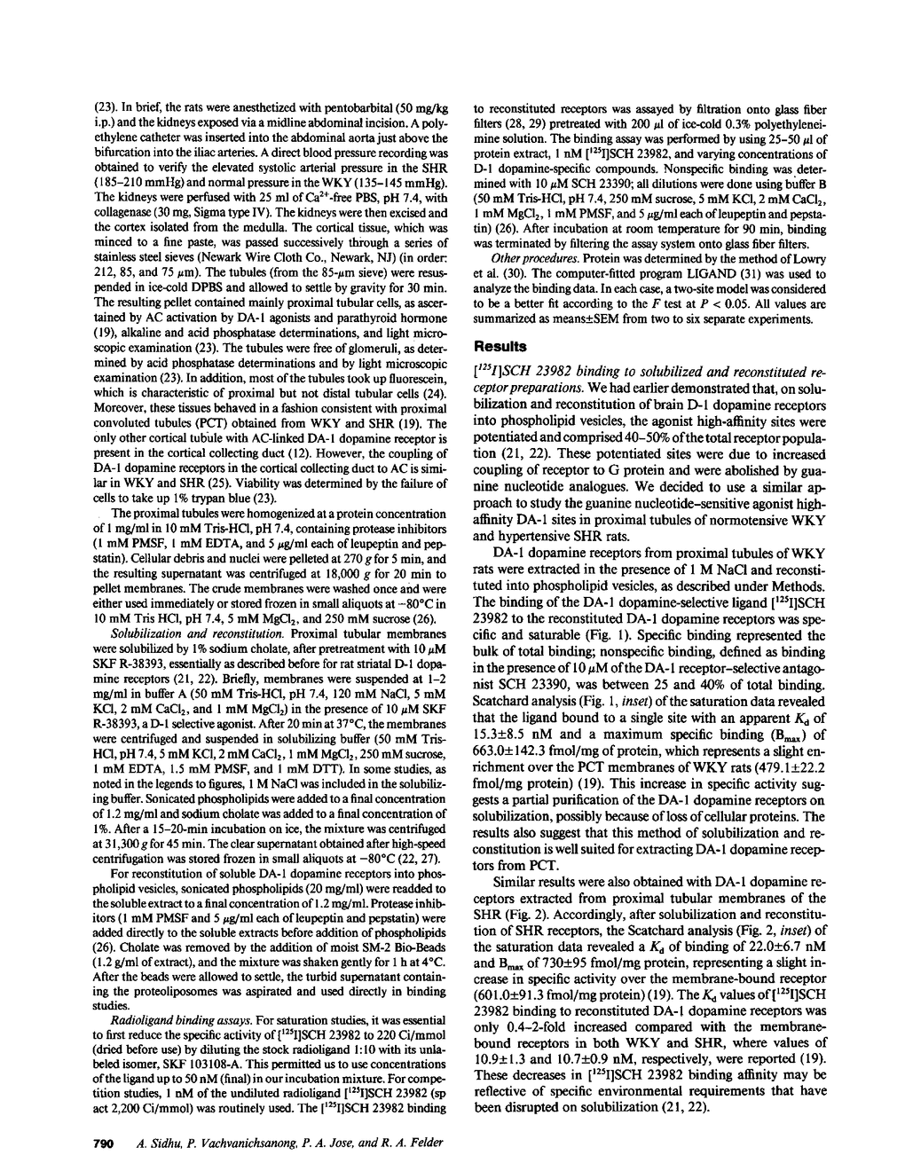 The natriuretic effect of dopamine-1 (DA-1) agonists is reduced in spontaneously hypertensive rat (SHR), partly because of defective DA-1 receptor-adenylate cyclase (AC) coupling in renal proximal convoluted tubules. To investigate this defective coupling, DA-1 dopamine receptors from renal proximal tubules were solubilized and reconstituted into phospholipid vesicles. The binding of DA-1-selective ligand [125I]SCH 23982 was specific and saturable, with no differences in receptor density or Kd between SHR and normotensive rats (Wistar-Kyoto rats; WKY). Competition experiments of the reconstituted DA-1 dopamine receptors in WKY with a DA-1-selective agonist, SKF R-38393, revealed the presence of high- (Kh = 350 +/- 209 nM) and low-affinity (Kl = 70,500 +/- 39,500 nM) binding sites. 100 microM Gpp(NH)p abolished the agonist high-affinity sites, converting them to a low-affinity state (Ki = 33,650 +/- 10,850 nM). In SHR, one affinity site was noted (Ki = 13,800 +/- 500) and was not modulated by Gpp(NH)p (Ki = 11,505 +/- 2,295). The absence of guanine nucleotide-sensitive agonist high-affinity sites may explain the defective DA-1/AC coupling mechanism in the SHR.