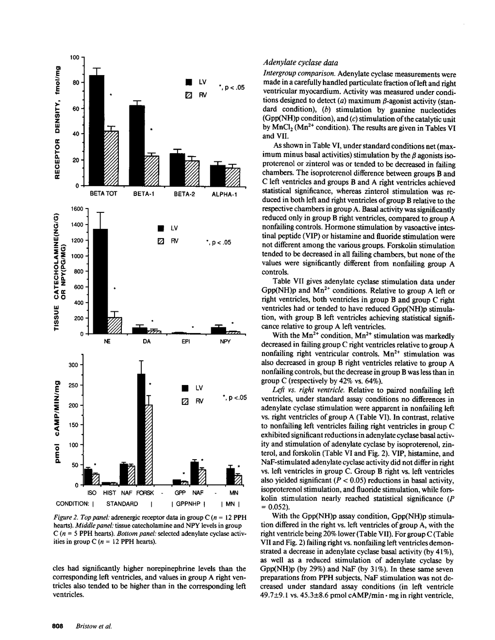 In order to investigate the general cause of beta-adrenergic receptor neuroeffector abnormalities in the failing human heart, we measured ventricular myocardial adrenergic receptors, adrenergic neurotransmitters, and beta-adrenergic receptor-effector responses in nonfailing and failing hearts taken from nonfailing organ donors, subjects with endstage biventricular failure due to idiopathic dilated cardiomyopathy (IDC), and subjects with primary pulmonary hypertension (PPH) who exhibited isolated right ventricular failure. Relative to nonfailing PPH left ventricles, failing PPH right ventricles exhibited (a) markedly decreased beta 1-adrenergic receptor density, (b) marked depletion of tissue norepinephrine and neuropeptide Y, (c) decreased adenylate cyclase stimulation in response to the beta agonists isoproterenol and zinterol, and (d) decreased adenylate cyclase stimulation in response to Gpp(NH)p and forskolin. These abnormalities were directionally similar to, but generally more pronounced than, corresponding findings in failing IDC right ventricles, whereas values for these parameters in nonfailing left ventricles of PPH subjects were similar to values in the nonfailing left ventricles of organ donors. Additionally, relative to paired nonfailing PPH left ventricles and nonfailing right ventricles from organ donors, failing right ventricles from PPH subjects exhibited decreased adenylate cyclase stimulation by MnCl2. These data indicate that: (a) Adrenergic neuroeffector abnormalities present in the failing human heart are due to local mechanisms; systemic processes do not produce beta-adrenergic neuroeffector abnormalities. (b) Pressure-overloaded failing right ventricles of PPH subjects exhibit decreased activity of the catalytic subunit of adenylate cyclase, an abnormality not previously described in the failing human heart.