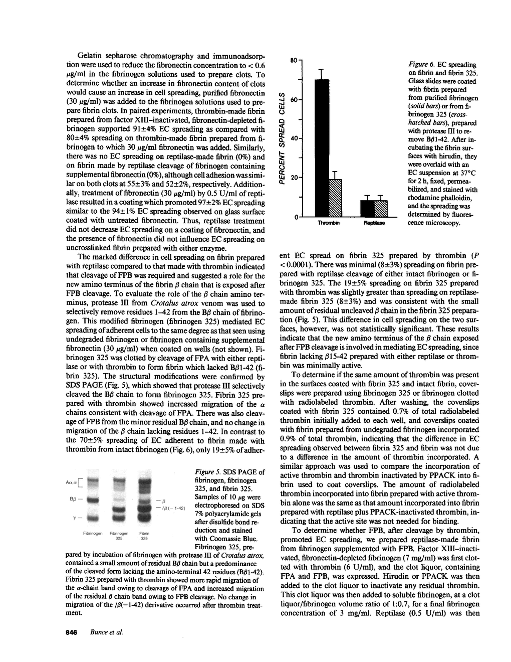Adhesion and spreading of cultured human umbilical vein endothelial cells on fibrin surfaces of varying structure were characterized to understand better the interactions occurring between endothelium and fibrin at sites of vascular injury. Fibrin prepared with reptilase, which cleaves only fibrinopeptide A from fibrinogen, and fibrin prepared with thrombin, which cleaves both fibrinopeptide A and fibrinopeptide B, equally supported endothelial cell adhesion. In contrast, only fibrin made with thrombin mediated endothelial cell spreading, as assessed by fluorescence microscopy of cells stained with rhodamine phalloidin to identify actin stress fibers or by scanning electron microscopy. Fibrin prepared with reptilase failed to support cell spreading. To further investigate the role of the amino terminus of the fibrin beta chain after fibrinopeptide B cleavage in promoting cell spreading, protease III from Crotalus atrox venom was used to specifically cleave the amino-terminal 42 residues of the fibrinogen B beta chain. After clotting with thrombin, this fibrin derivative lacking B beta 1-42 failed to support significant cell spreading. Spreading on fibrin was unaffected by depletion of Weibel-Palade bodies from endothelial cells, indicating that the spreading was independent of stimulated von Willebrand factor release. We conclude that endothelial cell spreading on fibrin requires fibrinopeptide B cleavage and involves residues 15-42 of the fibrin beta chain.