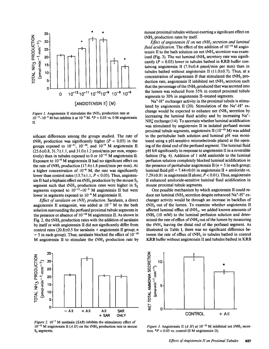 The effects of angiotensin II on total ammonia (tNH3) production and net secretion were investigated using in vitro microperfused mouse S2 proximal tubule segments incubated in Krebs-Ringer bicarbonate buffer containing 0.5 mM L-glutamine. Basolateral exposure of mouse S2 segments to 10(-11), 10(-10), and 10(-9) M angiotensin II stimulated tNH3 production rates by 23, 52, and 49%, respectively. Addition of 10(-6) M angiotensin II inhibited the tNH3 production rate by 34%. 10(-10) M angiotensin II inhibited net luminal secretion of tNH3 in the presence of enhanced luminal acidification and in the absence of altered luminal tNH3 efflux rates. Measurements of intracellular pH (pHi) and intracellular calcium concentration [( Ca2+]i) suggested that the effects of angiotensin II on tNH3 production were not mediated by changes in pHi but by the stimulatory effect of angiotensin II correlated with increased [Ca2+]i. Inhibition of the calcium-calmodulin-dependent pathway with W-7 blocked the stimulatory effect of 10(-10) M angiotensin II on tNH3 production and luminal acidification. These results indicate that angiotensin II has concentration-dependent effects on tNH3 production; that its action to stimulate tNH3 production may be mediated by rises in [Ca2+]i and the calcium-calmodulin pathway; and that angiotensin II, at concentrations that stimulate tNH3 production, inhibits net luminal ammonia secretion by a mechanism that is not mediated by diminished luminal acidification or by changes in luminal ammonia efflux rates.
