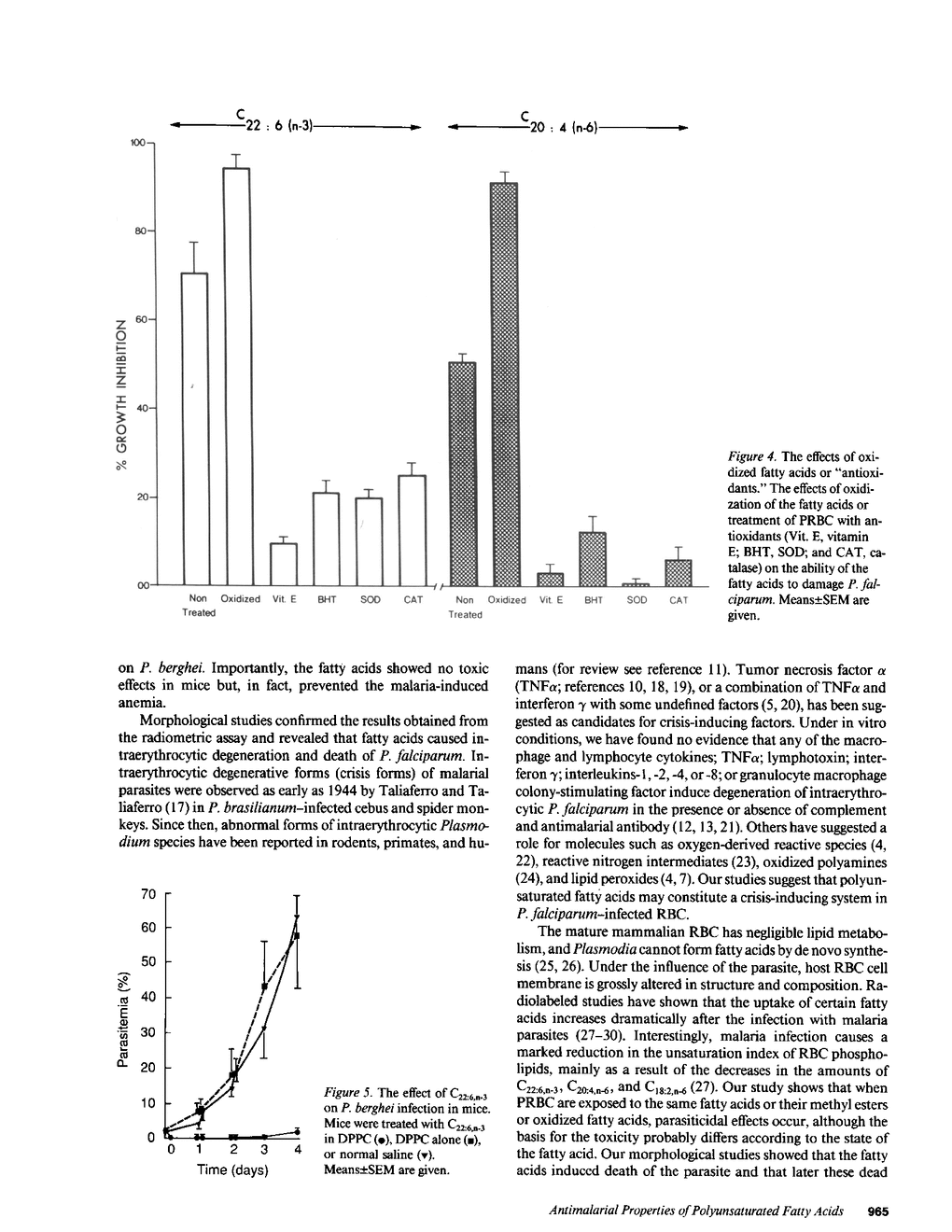 The polyunsaturated fatty acids docosahexaenoic acid (C22:6,n-3), eicosapentaenoic acid, arachidonic acid, and linoleic acid caused marked in vitro growth inhibition of Plasmodium falciparum, assessed by a radiometric assay. In contrast, negligible parasite killing was seen with oleic acid or docosanoic acid. Parasite killing was significantly increased when oxidized forms of polyunsaturated fatty acids were used. Antioxidants greatly reduced the fatty acid-induced killing. Mice infected with P. berghei and treated for 4 d with C22:6,n-3 showed marked reduction in parasitemia. The anemia associated with the infection was also alleviated by treatment with C22:6,n-3. The data provide new information that could be explored in order to develop new strategies in malaria treatment.