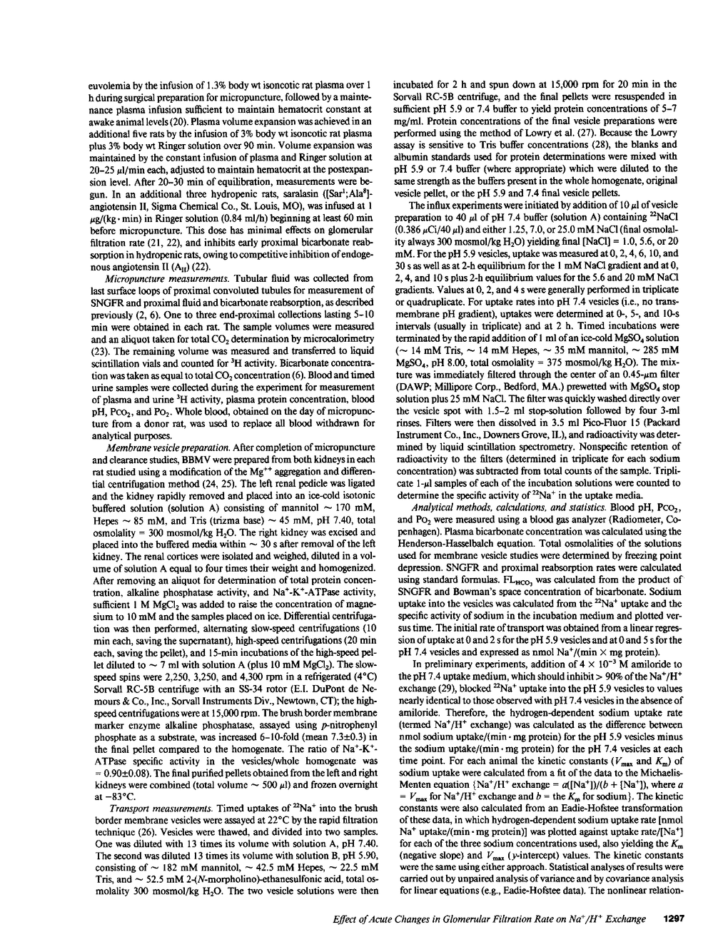 Studies were undertaken in Munich-Wistar rats to assess the influence of changes in filtered bicarbonate (FLHCO3), induced by changes in GFR, on Na+/H+ exchange activity in renal brush border membrane vesicles (BBMV). Whole-kidney and micropuncture measurements of GFR, FLHCO3, and whole-kidney and proximal tubule HCO3 reabsorption (APRHCO3) were coupled with BBMV measurements of H+ gradient-driven 22Na+ uptake in each animal studied. 22Na+ uptake was measured at three Na+ concentration gradients to allow calculation of Vmax and Km for Na+/H+ exchange. GFR was varied by studying animals under conditions of hydropenia, plasma repletion, and acute plasma expansion. The increase in GFR, FLHCO3, and APRHCO3 induced by plasma administration correlated directly with an increase in the Vmax for Na+/H+ exchange in BBMV. The Km for sodium was unaffected. In the plasma-expanded rats, the Vmax for Na+/H+ exchange was 22% greater than in the hydropenic rats (P less than 0.025) whereas APRHCO3 was 86% greater (P less than 0.001). These results indicate that increases in FLHCO3, induced by acute increases in GFR, stimulate Na+/H+ exchange activity in proximal tubular epithelium. This stimulation is a mechanism which can, in part, account for the delivery dependence of proximal bicarbonate reabsorption.