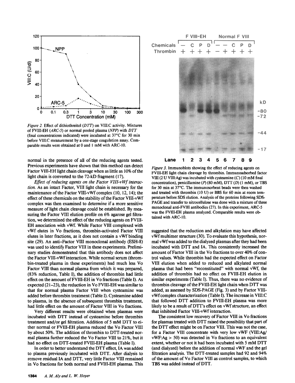 Factor VIII East Hartford (FVIII-EH) procoagulant activity is reduced because the substitution of cysteine for arginine 1689 abolishes an essential Factor VIII light chain thrombin cleavage site. Incubation of FVIII-EH plasma with penicillamine or DTT causes a five- to sixfold increase in FVIII-EH VIII:C, at 80 and 1 mM, respectively. While there is no FVIII-EH light chain cleavage when thrombin is added in the presence of penicillamine or DTT, these reducing agents disrupt the FVIII-vWf complex. For example, the addition of 5 mM DTT to normal or FVIII-EH plasma causes a 50% reduction in Factor VIII binding to vWf. These observations suggested that DTT increases FVIII-EH VIII:C by partial dissociation of FVIII-EH from vWf. This was verified by showing that vWf-free FVIII-EH had VIII:C activity of 21 U/dl, while the starting plasma level was 2.5 U/dl. Removal of other FVIII-EH plasma proteins by agarose gel filtration had no effect on VIII:C activity. The demonstration that this mutant Factor VIII has cofactor function when separated from vWf indicates that the dissociation of Factor VIII from vWf is an essential effect of Factor VIII light chain cleavage at arginine-1689.