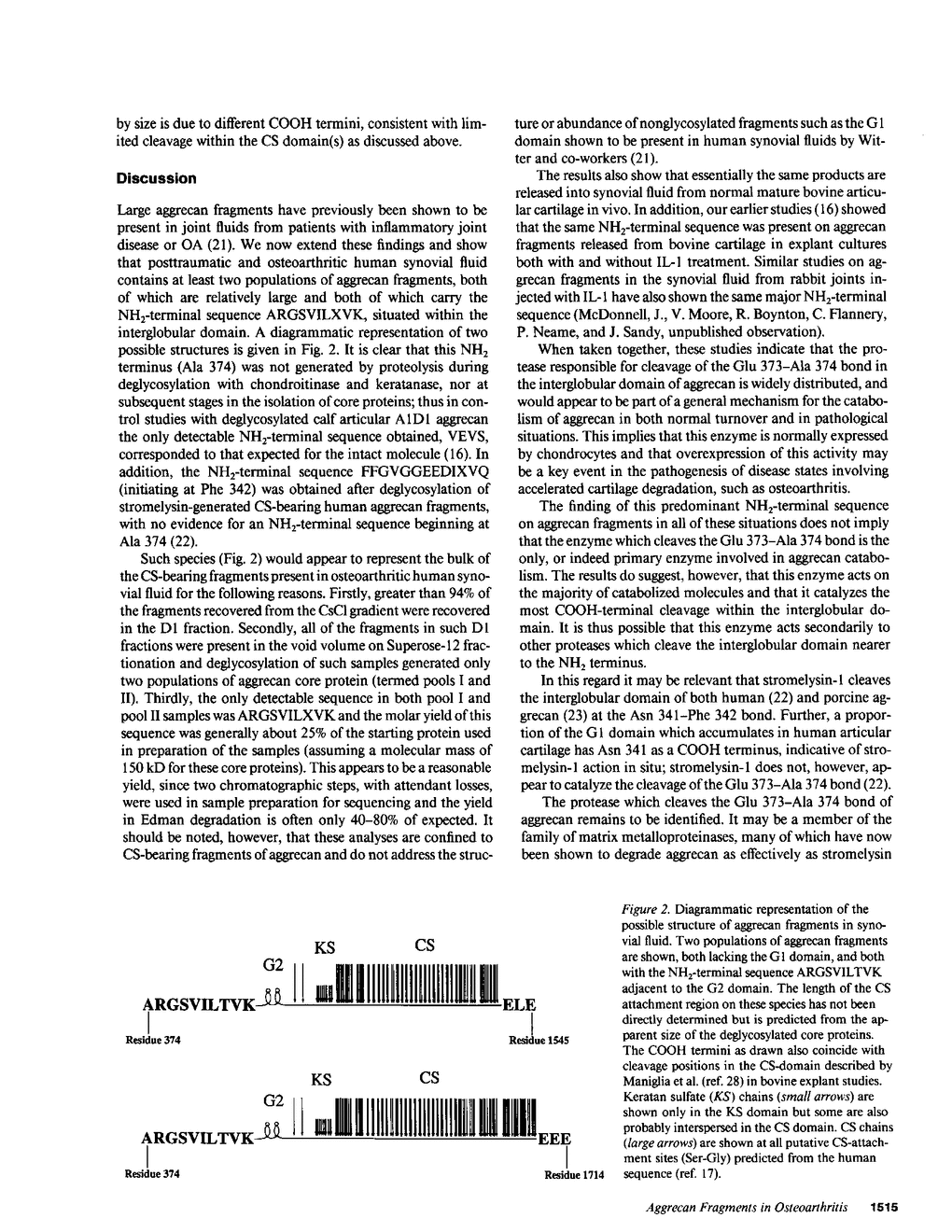 Synovial fluid was collected from patients with recent knee injury and from patients with early or late stage osteoarthritis. Chondroitin sulfate-substituted aggrecan fragments present in these fluids, and in normal bovine synovial fluid, were purified by cesium chloride gradient centrifugation, enzymically deglycosylated and fractionated by gel filtration on Superose-12. Each sample contained two major aggrecan core protein populations with apparent molecular masses of approximately 90 kD and 150 kD. For all samples, NH2-terminal analysis of both populations gave a single major sequence beginning ARGSV. This NH2 terminus results from cleavage of the human aggrecan core protein at the Glu 373-Ala 374 bond within the interglobular domain between the G1 and G2 domains. Cleavage at this site also occurs during control and interleukin-1 stimulated aggrecan catabolism in bovine cartilage explant cultures (Sandy, J., P. Neame, R. Boynton, and C. Flannery. 1991. J. Biol. Chem. 266:8683-8685). These results indicate that the major aggrecan fragments present in both osteoarthritic human synovial fluid and in normal bovine synovial fluid are large, being composed of a short NH2-terminal stretch of the interglobular domain, the G2 domain, the keratan sulfate domain, and variable lengths of the chondroitin sulfate domain(s). We conclude that the release of aggrecan fragments from articular cartilage into the synovial fluid seen at all stages of human osteoarthritis (Lohmander, L. S. 1991. Acta Orthop. Scand. 62:623-632) is promoted by the action of a normal cartilage proteinase which cleaves the Glu 373-Ala 374 bond of the interglobular domain.