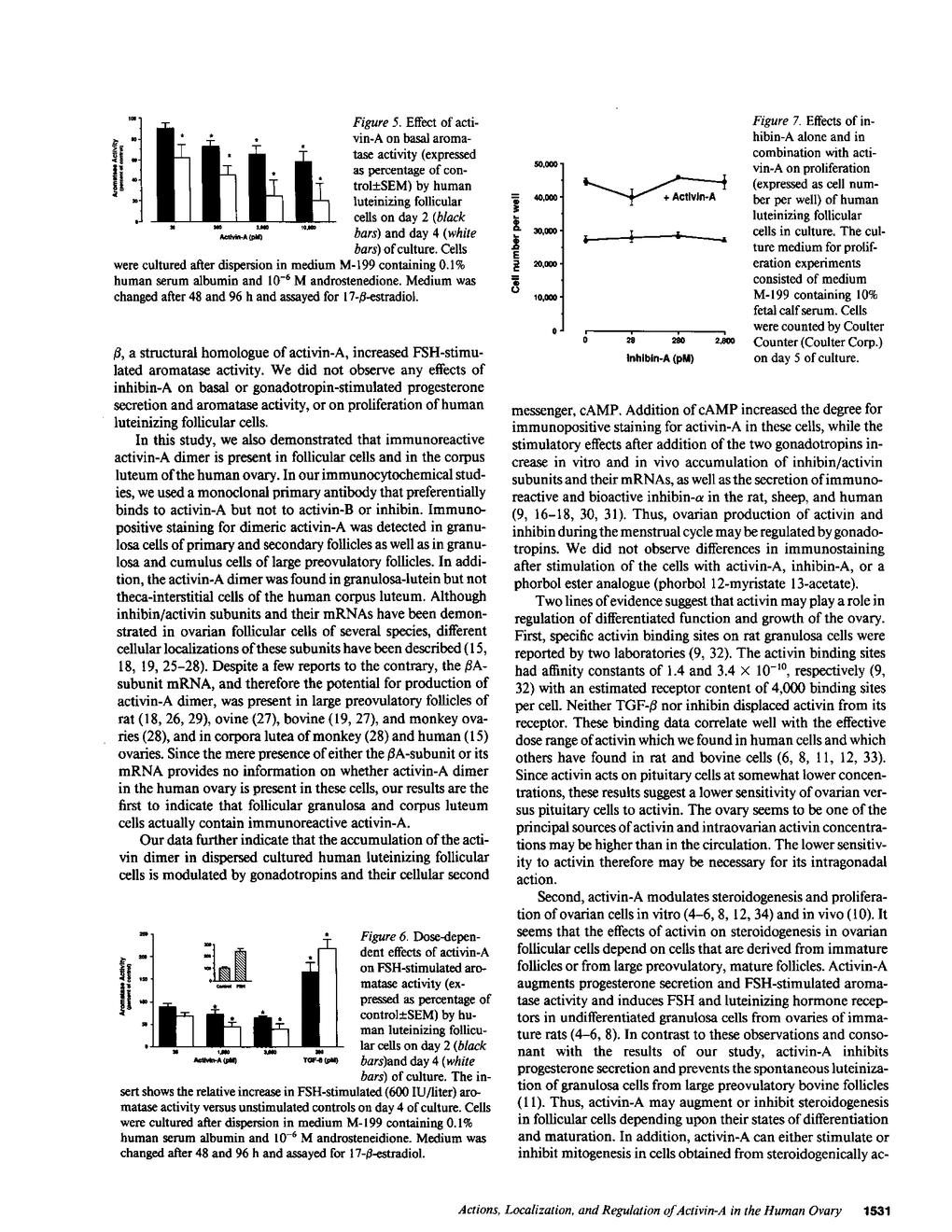 The actions, localization, and regulation of activin in the human ovary are unknown. Therefore, the aims of this study were (a) to define the effects of recombinant activin-A and its structural homologue, inhibin-A, on mitogenesis and steroidogenesis (progesterone secretion and aromatase activity) in human preovulatory follicular cells; (b) to localize the activin-A dimer in the human ovary by immunohistochemistry; and (c) to examine regulation of intracellular activin-A production in cultured human follicular cells. In addition to stimulating mitogenic activity, activin-A causes a dose- and time-dependent inhibition of basal and gonadotropin-stimulated progesterone secretion and aromatase activity in human luteinizing follicular cells on day 2 and day 4 of culture. Inhibin-A exerts no effects on mitogenesis, basal or gonadotropin-stimulated progesterone secretion and aromatase activity, and does not alter effects observed with activin-A alone. Immunostaining for dimeric activin-A occurs in granulosa and cumulus cells of human ovarian follicles and in granulosa-lutein cells of the human corpus luteum. cAMP, and to a lesser degree human chorionic gonadotropin and follicle-stimulating hormone, but not inhibin-A, activin-A, or phorbol 12-myristate 13-acetate, increased the immunostaining for activin-A in cultured granulosa cells. These results indicate that activin-A may function as an autocrine or paracrine regulator of follicular function in the human ovary.