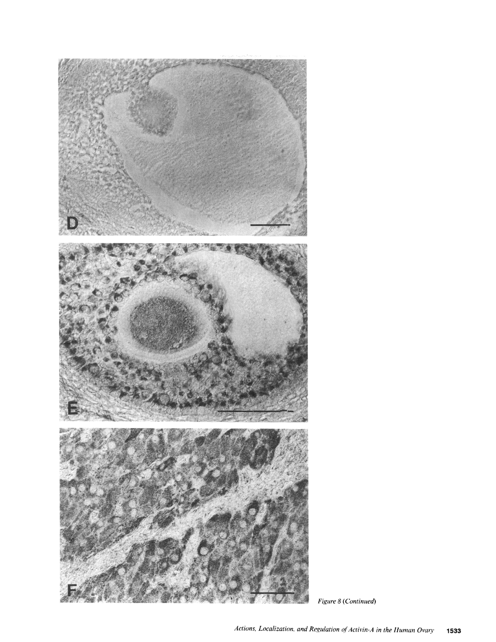 The actions, localization, and regulation of activin in the human ovary are unknown. Therefore, the aims of this study were (a) to define the effects of recombinant activin-A and its structural homologue, inhibin-A, on mitogenesis and steroidogenesis (progesterone secretion and aromatase activity) in human preovulatory follicular cells; (b) to localize the activin-A dimer in the human ovary by immunohistochemistry; and (c) to examine regulation of intracellular activin-A production in cultured human follicular cells. In addition to stimulating mitogenic activity, activin-A causes a dose- and time-dependent inhibition of basal and gonadotropin-stimulated progesterone secretion and aromatase activity in human luteinizing follicular cells on day 2 and day 4 of culture. Inhibin-A exerts no effects on mitogenesis, basal or gonadotropin-stimulated progesterone secretion and aromatase activity, and does not alter effects observed with activin-A alone. Immunostaining for dimeric activin-A occurs in granulosa and cumulus cells of human ovarian follicles and in granulosa-lutein cells of the human corpus luteum. cAMP, and to a lesser degree human chorionic gonadotropin and follicle-stimulating hormone, but not inhibin-A, activin-A, or phorbol 12-myristate 13-acetate, increased the immunostaining for activin-A in cultured granulosa cells. These results indicate that activin-A may function as an autocrine or paracrine regulator of follicular function in the human ovary.