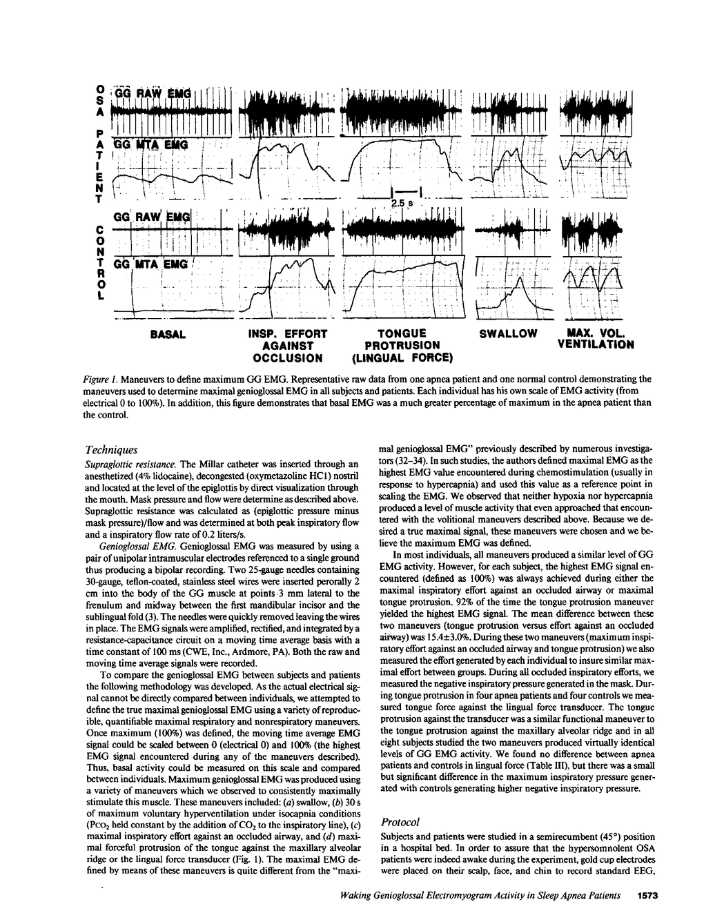 Pharyngeal collapse in obstructive sleep apnea patients is likely a product of a sleep-related decrement in pharyngeal dilator muscle activity superimposed upon abnormal airway anatomy. We postulate that during wakefulness, increased pharyngeal dilator muscle activity in apnea patients compensates for diminished airway size thus maintaining patency. We studied the waking genioglossus (GG) electromyogram (EMG) activity in 11 OSA patients and 14 age-matched controls to determine if GG activity is higher in the awake state in apnea patients than controls. To make this determination, we developed a reproducible methodology whereby true maximal GG EMG could be defined and thus basal activity quantitated as a percentage of this maximal value. Therefore, direct comparisons of basal activity between individuals was possible. We observed apnea patients to have significantly greater basal genioglossal activity compared to controls (40.6 +/- 5.6% vs. 12.7 +/- 1.7% of maximum). This difference persisted when size-matched subsets were compared. This augmented GG activity in apnea patients could be reduced with positive airway pressure. We speculate that this neuromuscular compensation present during wakefulness in apnea patients may be lost during sleep leading to airway collapse.