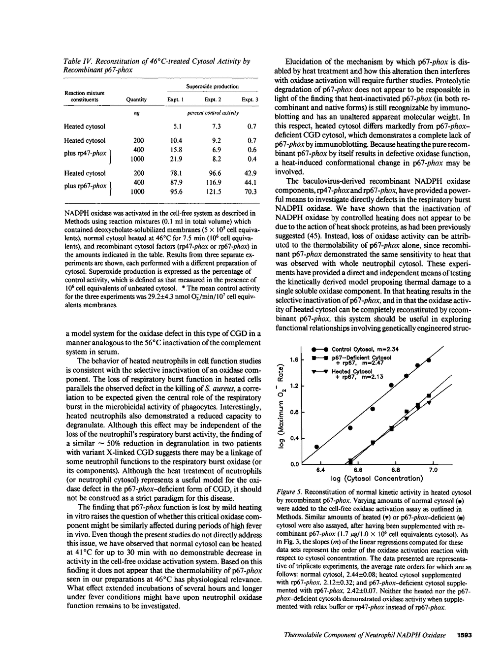 Mild heating of human neutrophils inactivates the respiratory burst oxidase, producing a defect in superoxide production and bacterial killing comparable to that seen in patients afflicted with chronic granulomatous disease (CGD). We have now investigated the mechanism and specificity of this inactivation by examining the effect of mild heating on the known oxidase components: the membrane-bound subunits of the cytochrome b558 (gp91-phox and p22-phox) and the two cytosolic oxidase factors (p47-phox and p67-phox). Heating (46 degrees C for 7.5 min) caused intact neutrophils to lose greater than 85% of their capacity to produce superoxide, a defect which was localized to the cytosolic, but not the membrane, fraction. Complementation studies with CGD cytosols deficient in either p47-phox or p67-phox suggested that the defective component of heat-inactivated cytosol was p67-phox. This was confirmed by experiments showing that recombinant p67-phox, but not p47-phox, exhibited lability at 46 degrees C and completely reconstituted oxidase activity of heat-treated cytosol. These studies indicate that mild heating of either intact neutrophils or normal neutrophil cytosol results in a selective inactivation of p67-phox, providing a model oxidase system for the extremely rare p67-phox-deficient form of CGD.