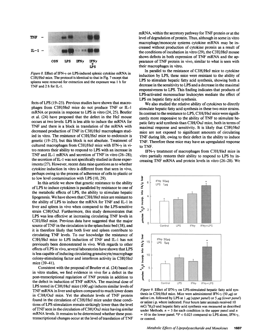 To examine the role of cytokines in mediating the lipogenic effects of endotoxin (LPS), we studied the effects of LPS and cytokines on hepatic fatty acid synthesis in LPS-sensitive C3H/OuJ mice and in LPS-resistant C3H/HeJ mice, whose macrophages are defective in the ability to produce tumor necrosis factor (TNF) and IL-1 in response to LPS. HeJ mice were 16-fold less sensitive than OuJ mice to the lipogenic effect of LPS. In OuJ mice, 10 micrograms of LPS caused a maximal increase in hepatic lipogenesis (3.86 +/- 0.41-fold), whereas in HeJ mice the maximal increase was only 1.79 +/- 0.32-fold after 100 micrograms of LPS. This lipogenic response paralleled the decreased ability of LPS to increase hepatic and splenic levels of mRNAs for TNF and IL-1 and serum levels of TNF in HeJ mice. In contrast, the maximal effect of TNF on lipogenesis was greater and the sensitivity to TNF was increased 2.4-fold in HeJ mice compared to OuJ mice. Administration of IFN-gamma before LPS in HeJ mice had no effect on IL-1 mRNA, but partially restored the LPS-induced increase in hepatic and splenic mRNA for TNF and serum TNF levels, which may account for the partial restoration of sensitivity to the lipogenic effect of LPS after IFN-gamma treatment. These results indicate that cytokines produced by mononuclear leukocytes mediate the lipogenic effects of LPS.