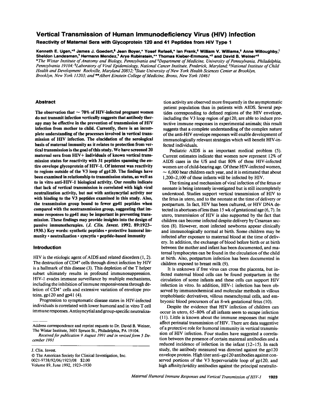 K E Ugen, J J Goedert, J Boyer, Y Refaeli, I Frank, W V Williams, A Willoughby, S Landesman, H Mendez, A Rubinstein