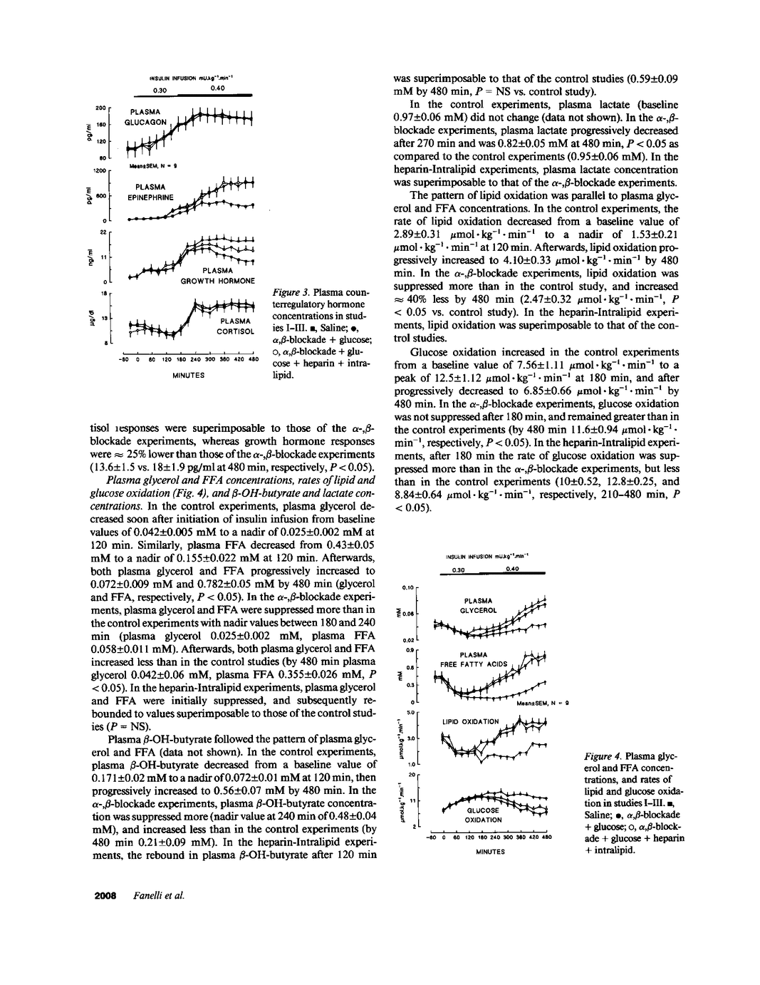 Three studies were performed on nine normal volunteers to assess whether catecholamine-mediated lipolysis contributes to counterregulation to hypoglycemia. In these three studies, insulin was intravenously infused for 8 h (0.30 mU.kg-1.min-1 from 0 to 180 min, and 0.40 mU.kg-1.min-1 until 480 min). In study I (control study), only insulin was infused; in study II (direct + indirect effects of catecholamines), propranolol and phentolamine were superimposed to insulin and exogenous glucose was infused to reproduce the same plasma glucose (PG) concentration of study I. Study III (indirect effect of catecholamines) was the same as study II, except heparin (0.2 U.kg-1.min-1 after 80 min), 10% Intralipid (1 ml.min-1 after 160 min) and variable glucose to match PG of study II, were also infused. Glucose production (HGO), glucose utilization (Rd) [3-3H]glucose, and glucose oxidation and lipid oxidation (LO) (indirect calorimetry) were determined. In all three studies, PG decreased from approximately 4.8 to approximately 2.9 mmol/liter (P = NS between studies), and plasma glycerol and FFA decreased to a nadir at 120 min. Afterwards, in study I plasma glycerol and FFA increased by approximately 75% at 480 min, but in study II they remained approximately 40% lower than in study I, whereas in study III they rebounded as in study I (P = NS). In study II, LO was lower than in study I (1.69 +/- 0.13 vs. 3.53 +/- 0.19 mumol.kg-1.min-1, P less than 0.05); HGO was also lower between 60 and 480 min (7.48 +/- 0.57 vs. 11.6 +/- 0.35 mumol.kg-1.min-1, P less than 0.05), whereas Rd was greater between 210 and 480 min (19 +/- 0.38 vs. 11.4 +/- 0.34 mumol.kg-1.min-1, respectively, P less than 0.05). In study III, LO increased to the values of study I; between 4 and 8 h, HGO increased by approximately 2.5 mumol.kg-1.min-1, and Rd decreased by approximately 7 mumol.kg-1.min-1 vs. study II. We conclude that, in a late phase of hypoglycemia, the indirect effects of catecholamines (lipolysis mediated) account for at least approximately 50% of the adrenergic contribution to increased HGO, and approximately 85% of suppressed Rd.