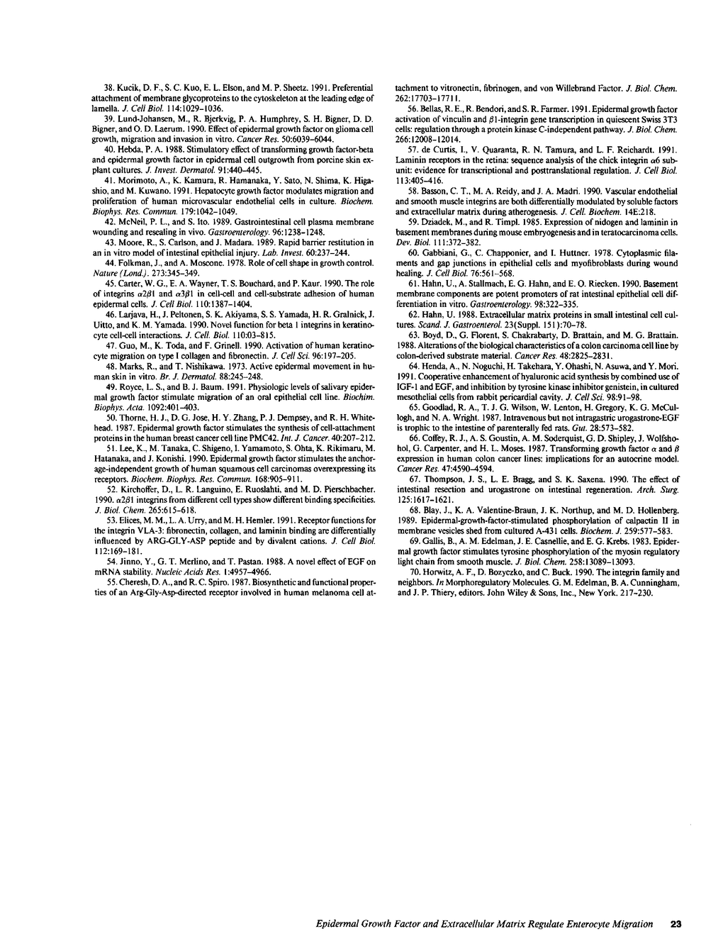 The modulation of enterocyte sheet migration was studied using Caco-2 cells, a well-differentiated human colonic cell line. Although Caco-2 cells attached and spread equivalently over collagen types I, III, IV, and V and laminin, migration over laminin was significantly slower than migration over the collagen types. Fibronectin was a poor substrate for attachment, spreading, and migration. Epidermal growth factor (EGF) stimulated migration over laminin but did not alter Caco-2 migration over collagen or fibronectin. This effect was independent of cell proliferation, which was stimulated equivalently on both laminin and collagen I. Expression and organization of cell surface receptors for matrix (integrins) were studied using antibodies specific for beta and alpha integrin subunits. Integrin surface expression was assessed by immunoprecipitation of surface 125iodinated control and EGF-treated cells. Beta 1 surface pools did not change substantially in any condition studied. Alpha 1 subunit pools were decreased after EGF treatment on collagen I but alpha 1 pools increased after EGF treatment on laminin. Surface pools of alpha 2 subunits were increased following EGF treatment whether cells were cultured on laminin or collagen I. However, traditional immunofluorescent and laser confocal imaging demonstrated substantial differences in the character of alpha 2 subunit organization between collagen and laminin in the migrating cell front. Furthermore, a functional antibody to the alpha 2 subunit inhibited EGF stimulation of migration over laminin without substantial effects on basal migration over laminin or collagen I. Thus, EGF appears to exert a matrix-specific effect on enterocyte migration by modulation of integrin expression and organization.