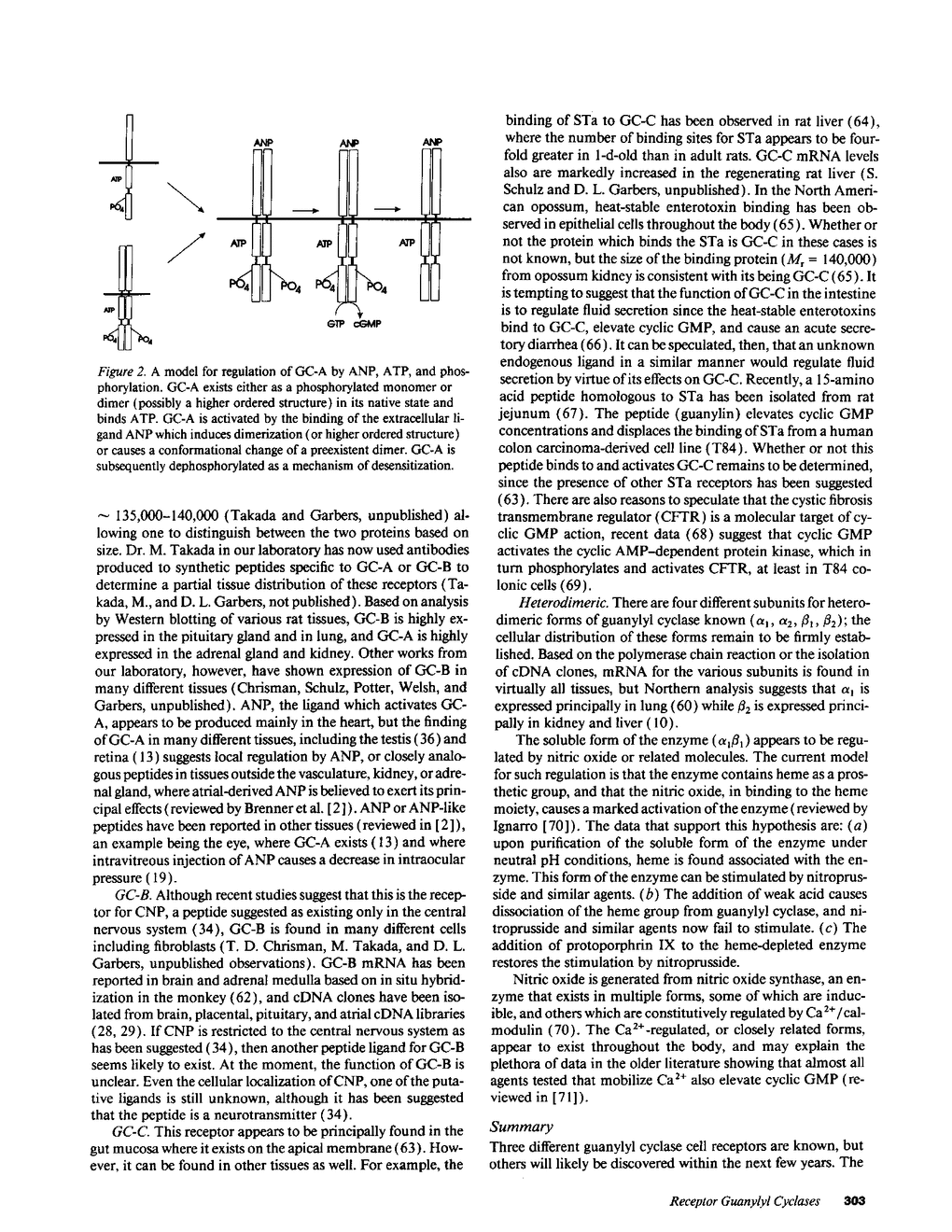 Three different guanylyl cyclase cell receptors are known, but others will likely be discovered within the next few years. The general function of these receptors appear to relate to the regulation of fluid volume or fluid movement. New receptors, or possibly the currently known receptors, therefore, may be discovered in areas of the body where fluid volume regulation is important. Such fluids whose volume or composition might be regulated by guanylyl cyclase receptors include synovial fluid, uterine/oviductal luminal fluid, follicular fluid, aqueous humor, cerebral spinal fluid, seminiferous tubule luminal fluid, epididymal luminal fluid, seminal plasma, and airway luminal fluid. The function of the heterodimeric forms of guanylyl cyclase appear to relate to a primary regulation of nitric oxide (or similar molecules) concentrations, which are in turn regulated by a Ca2+/calmodulin-sensitive nitric oxide synthase.