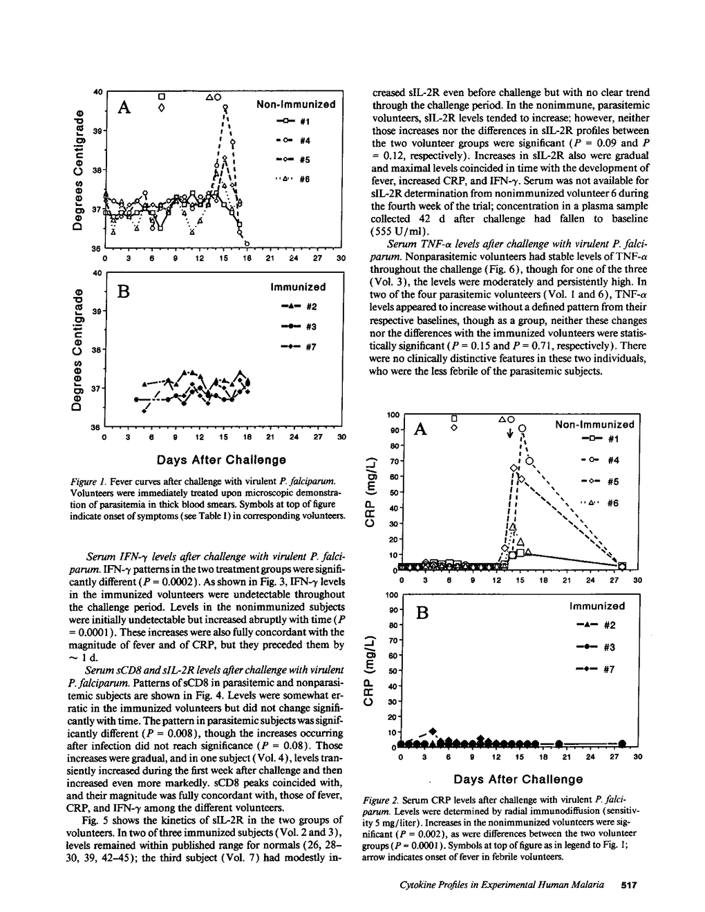 Serum cytokine profiles were evaluated in immunized and nonimmunized human volunteers after challenge with infectious Plasmodium falciparum sporozoites. Three volunteers had been immunized with x-irradiated sporozoites and were fully protected from infection. Four nonimmune volunteers all developed symptomatic infection at which time they were treated. Sera from all volunteers were collected at approximately 20 time points during the 28-d challenge period; levels of IL-1 alpha, IL-1 beta, IL-2, IFN-gamma, tumor necrosis factor-alpha, IL-4, IL-6, granulocyte macrophage-colony-stimulating factor, and soluble CD4, CD8, and IL-2 receptor (sCD4, sCD8, and sIL-2R, respectively) were determined by ELISA. C-reactive protein (CRP) was assayed by radial immunodiffusion. Parasitemic subjects developed increases in CRP and IFN-gamma, with less marked increases in sIL-2R and sCD8; the other cytokines tested did not change. CRP increases were abrupt and occurred at the onset of fever (day 14 after challenge). IFN-gamma increases were also abrupt, preceding those of fever and CRP by one day. Increases in sIL-2R and sCD8 were more gradual. Increases in fever, CRP, IFN-gamma, and sCD8 were concordant in each volunteer. Early IL-6 increases were noted in the protected vaccinees. Thus, after challenge with virulent P. falciparum, unique systemic cytokine profiles were detectable both in immunized, nonparasitemic volunteers and in unvaccinated, parasitemic subjects. The contrasting cytokine profiles in the two groups may relate to mechanisms of protection and immunopathology in experimental human malaria.