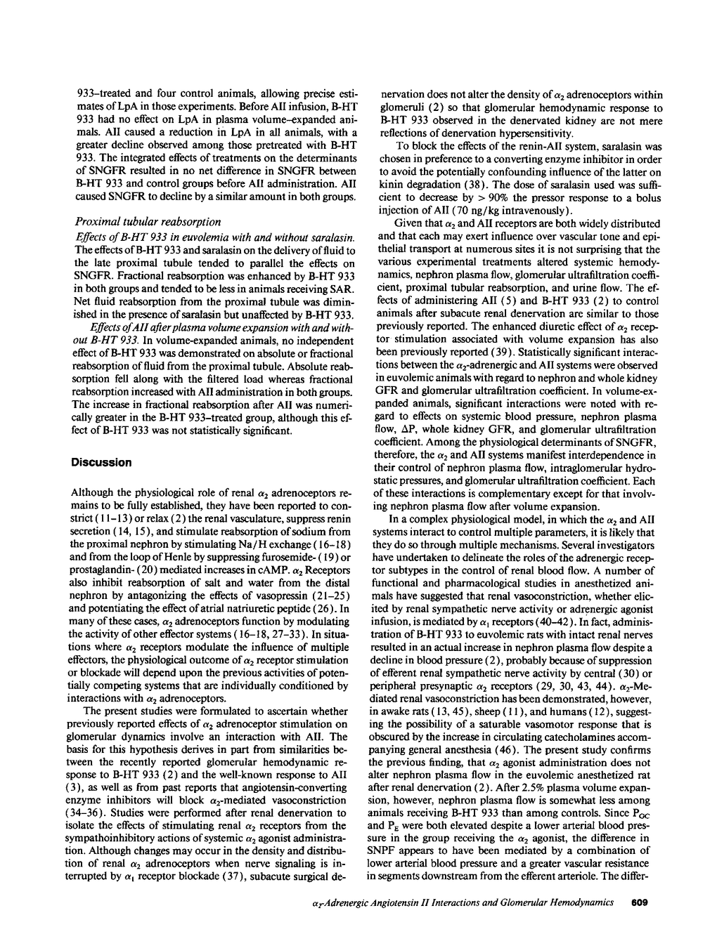 The hypothesis that renal alpha 2 adrenoceptors influence nephron filtration rate (SNGFR) via interaction with angiotensin II (AII) was tested by renal micropuncture. The physical determinants of SNGFR were assessed in adult male Munich Wistar rats 5-7 d after ipsilateral surgical renal denervation (DNX). DNX was performed to isolate inhibitory central and presynaptic alpha 2 adrenoceptors from end-organ receptors within the kidney. Two experimental protocols were employed: one to test whether prior AII receptor blockade with saralasin would alter the glomerular hemodynamic response to alpha 2 adrenoceptor stimulation with the selective agonist B-HT 933 under euvolemic conditions, and the other to test whether B-HT 933 would alter the response to exogenous AII under conditions of plasma volume expansion. In euvolemic rats, B-HT 933 caused SNGFR to decline as the result of a decrease in glomerular ultrafiltration coefficient (LpA), an effect that was blocked by saralasin. After plasma volume expansion, B-HT 933 showed no primary effect on LpA but heightened the response of arterial blood pressure, glomerular transcapillary pressure gradient, and LpA to AII. The parallel results of these converse experiments suggest a complementary interaction between renal alpha 2-adrenergic and AII systems in the control of LpA.