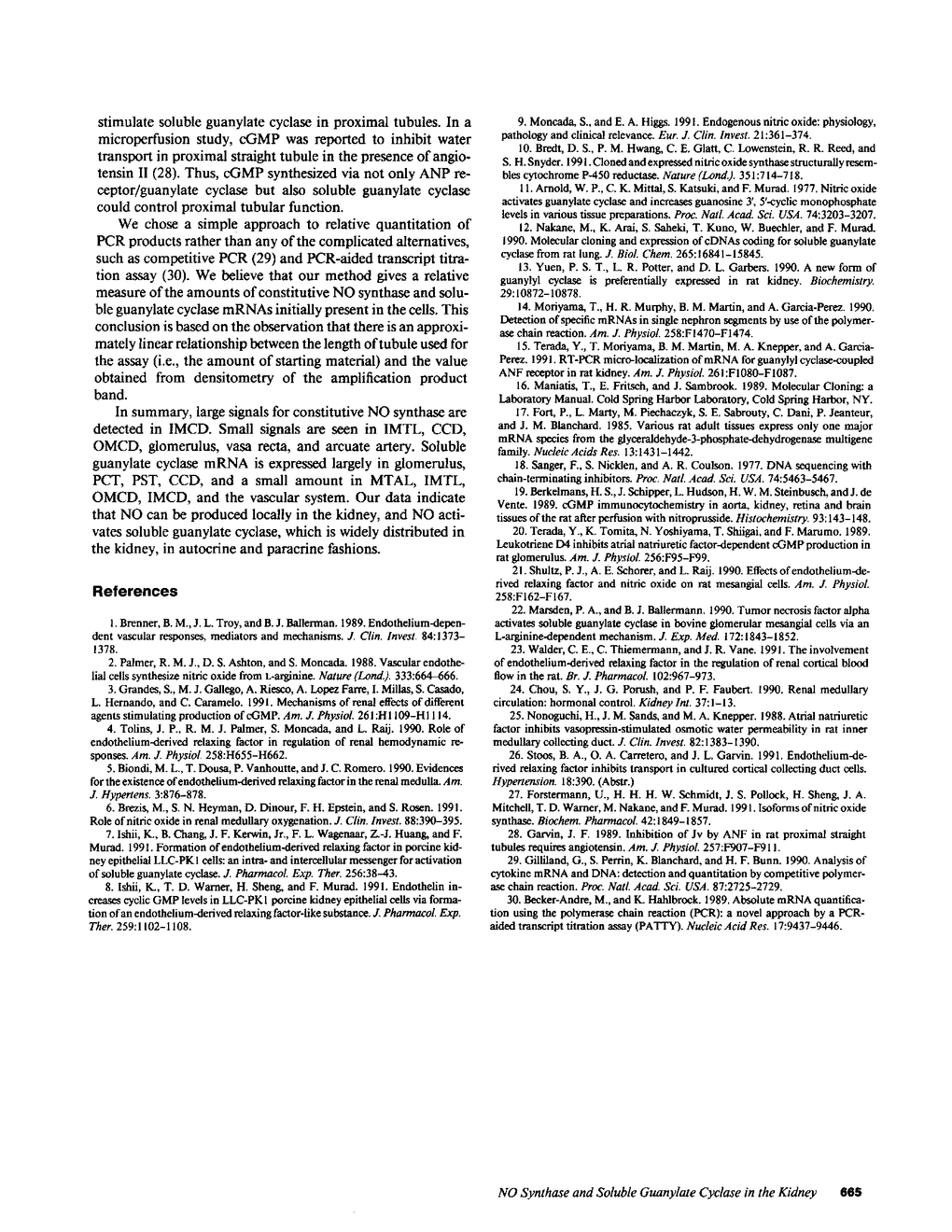 Stimulation of the release of nitric oxide (NO) in the kidney has been shown to result in renal hemodynamic changes and natriuresis. NO is a potent stimulator of soluble guanylate cyclase, leading to an increase of cyclic GMP. The precise localization of NO synthase and soluble guanylate cyclase in the renal structure is not known. In this study, the microlocalization of mRNAs coding for constitutive NO synthase and soluble guanylate cyclase was carried out in the rat kidney, using an assay of reverse transcription and polymerase chain reaction in individual microdissected renal tubule segments along the nephron, glomeruli, vasa recta bundle, and arcuate arteries. A large signal for constitutive NO synthase was detected in inner medullary collecting duct. Small signals were detected in inner medullary thin limb, cortical collecting duct, outer medullary collecting duct, glomerulus, vasa recta, and arcuate artery. Soluble guanylate cyclase mRNA is expressed largely in glomerulus, proximal convoluted tubule, proximal straight tubule, and cortical collecting duct, and in small amounts in medullary thick ascending limb, inner medullary thin limb, outer medullary collecting duct, inner medullary collecting duct, and the vascular system. Our data demonstrate that NO can be produced locally in the kidney, and that soluble guanylate cyclase is widely distributed in glomerulus, renal tubules, and the vascular system.