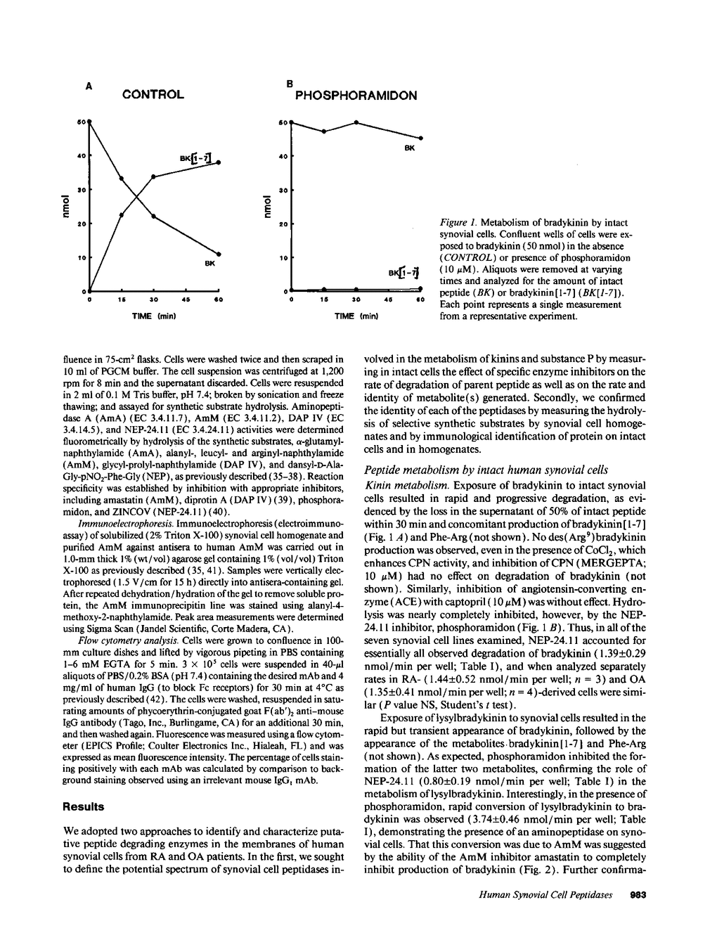 Kinins and substance P have been implicated in the pathogenesis of inflammatory arthritis by virtue of their abilities to induce vasodilation, edema, and pain. The relative biological potencies of these peptides in vivo would depend at least in part upon their rates of catabolism in the joint. We hypothesized that human synovial lining cells may regulate intraarticular levels of kinins and neuropeptides via degradation by cell surface-associated peptidases. We exposed intact human synovial fibroblasts to kinins and substance P, in the presence or absence of specific peptidase inhibitors, and measured the amount of intact substrate remaining and degradation product(s) generated over time. Aminopeptidase M (AmM; EC 3.4.11.2), neutral endopeptidase-24.11 (NEP-24.11; EC 3.4.24.11), and dipeptidyl(amino)peptidase IV (DAP IV; EC 3.4.14.5) were identified on the cell surface of synovial cells. Bradykinin degradation was due entirely to NEP-24.11 (1.39 +/- 0.29 nmol/min per well). Lysylbradykinin was also degraded by NEP-24.11 (0.80 +/- 0.19 nmol/min per well); however, in the presence of phosphoramidon, AmM-mediated conversion to bradykinin (3.74 +/- 0.46 nmol/min per well) could be demonstrated. The combined actions of NEP-24.11 (0.93 +/- 0.15 nmol/min per well) and DAP IV (0.84 +/- 0.18 nmol/min per well) were responsible for the degradation of substance P. AmM (2.44 +/- 0.33 nmol/min per well) and NEP-24.11 (1.30 +/- 0.45 nmol/min per well) were responsible for the degradation of the opioid peptide, [Leu5]enkephalin. The identity of each of the three peptidases was confirmed via synthetic substrate hydrolysis, inhibition profile, and immunological identification. The profiles of peptidase enzymes identified in cells derived from rheumatoid and osteoarthritic joints were identical. These data demonstrate the human synovial fibroblast to be a rich source of three specific peptidases and suggest that it may play a prominent role in regulating peptide levels in the joint.