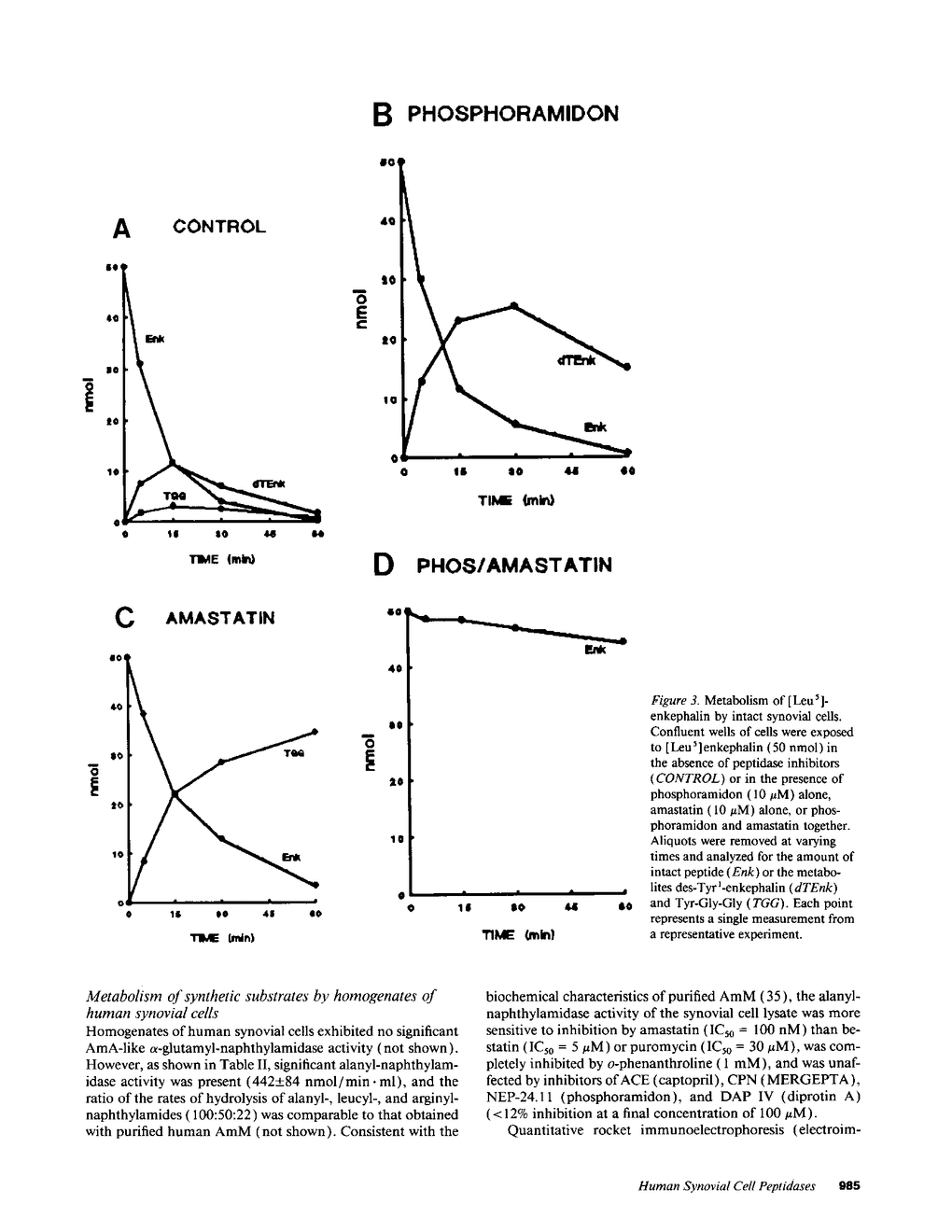 Kinins and substance P have been implicated in the pathogenesis of inflammatory arthritis by virtue of their abilities to induce vasodilation, edema, and pain. The relative biological potencies of these peptides in vivo would depend at least in part upon their rates of catabolism in the joint. We hypothesized that human synovial lining cells may regulate intraarticular levels of kinins and neuropeptides via degradation by cell surface-associated peptidases. We exposed intact human synovial fibroblasts to kinins and substance P, in the presence or absence of specific peptidase inhibitors, and measured the amount of intact substrate remaining and degradation product(s) generated over time. Aminopeptidase M (AmM; EC 3.4.11.2), neutral endopeptidase-24.11 (NEP-24.11; EC 3.4.24.11), and dipeptidyl(amino)peptidase IV (DAP IV; EC 3.4.14.5) were identified on the cell surface of synovial cells. Bradykinin degradation was due entirely to NEP-24.11 (1.39 +/- 0.29 nmol/min per well). Lysylbradykinin was also degraded by NEP-24.11 (0.80 +/- 0.19 nmol/min per well); however, in the presence of phosphoramidon, AmM-mediated conversion to bradykinin (3.74 +/- 0.46 nmol/min per well) could be demonstrated. The combined actions of NEP-24.11 (0.93 +/- 0.15 nmol/min per well) and DAP IV (0.84 +/- 0.18 nmol/min per well) were responsible for the degradation of substance P. AmM (2.44 +/- 0.33 nmol/min per well) and NEP-24.11 (1.30 +/- 0.45 nmol/min per well) were responsible for the degradation of the opioid peptide, [Leu5]enkephalin. The identity of each of the three peptidases was confirmed via synthetic substrate hydrolysis, inhibition profile, and immunological identification. The profiles of peptidase enzymes identified in cells derived from rheumatoid and osteoarthritic joints were identical. These data demonstrate the human synovial fibroblast to be a rich source of three specific peptidases and suggest that it may play a prominent role in regulating peptide levels in the joint.