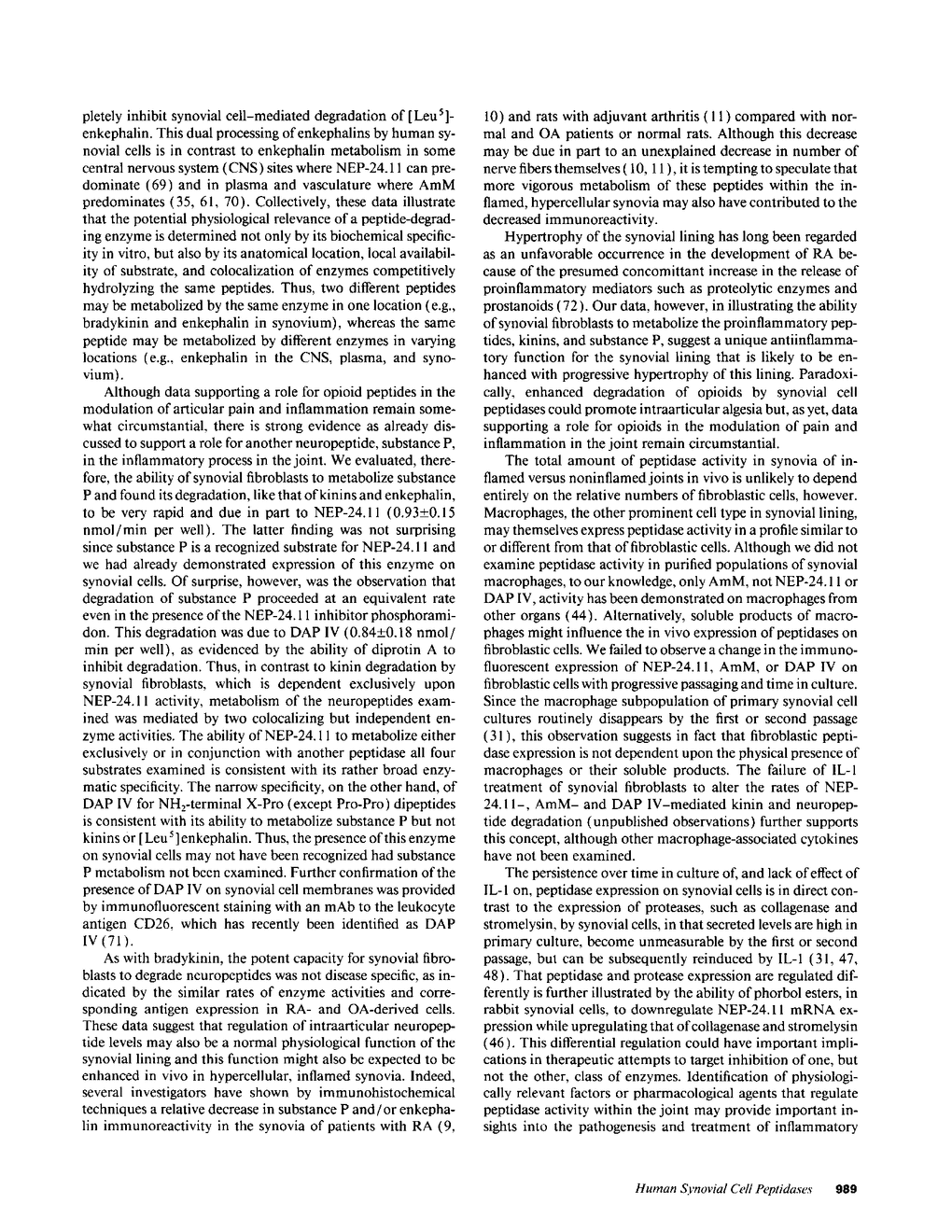 Kinins and substance P have been implicated in the pathogenesis of inflammatory arthritis by virtue of their abilities to induce vasodilation, edema, and pain. The relative biological potencies of these peptides in vivo would depend at least in part upon their rates of catabolism in the joint. We hypothesized that human synovial lining cells may regulate intraarticular levels of kinins and neuropeptides via degradation by cell surface-associated peptidases. We exposed intact human synovial fibroblasts to kinins and substance P, in the presence or absence of specific peptidase inhibitors, and measured the amount of intact substrate remaining and degradation product(s) generated over time. Aminopeptidase M (AmM; EC 3.4.11.2), neutral endopeptidase-24.11 (NEP-24.11; EC 3.4.24.11), and dipeptidyl(amino)peptidase IV (DAP IV; EC 3.4.14.5) were identified on the cell surface of synovial cells. Bradykinin degradation was due entirely to NEP-24.11 (1.39 +/- 0.29 nmol/min per well). Lysylbradykinin was also degraded by NEP-24.11 (0.80 +/- 0.19 nmol/min per well); however, in the presence of phosphoramidon, AmM-mediated conversion to bradykinin (3.74 +/- 0.46 nmol/min per well) could be demonstrated. The combined actions of NEP-24.11 (0.93 +/- 0.15 nmol/min per well) and DAP IV (0.84 +/- 0.18 nmol/min per well) were responsible for the degradation of substance P. AmM (2.44 +/- 0.33 nmol/min per well) and NEP-24.11 (1.30 +/- 0.45 nmol/min per well) were responsible for the degradation of the opioid peptide, [Leu5]enkephalin. The identity of each of the three peptidases was confirmed via synthetic substrate hydrolysis, inhibition profile, and immunological identification. The profiles of peptidase enzymes identified in cells derived from rheumatoid and osteoarthritic joints were identical. These data demonstrate the human synovial fibroblast to be a rich source of three specific peptidases and suggest that it may play a prominent role in regulating peptide levels in the joint.