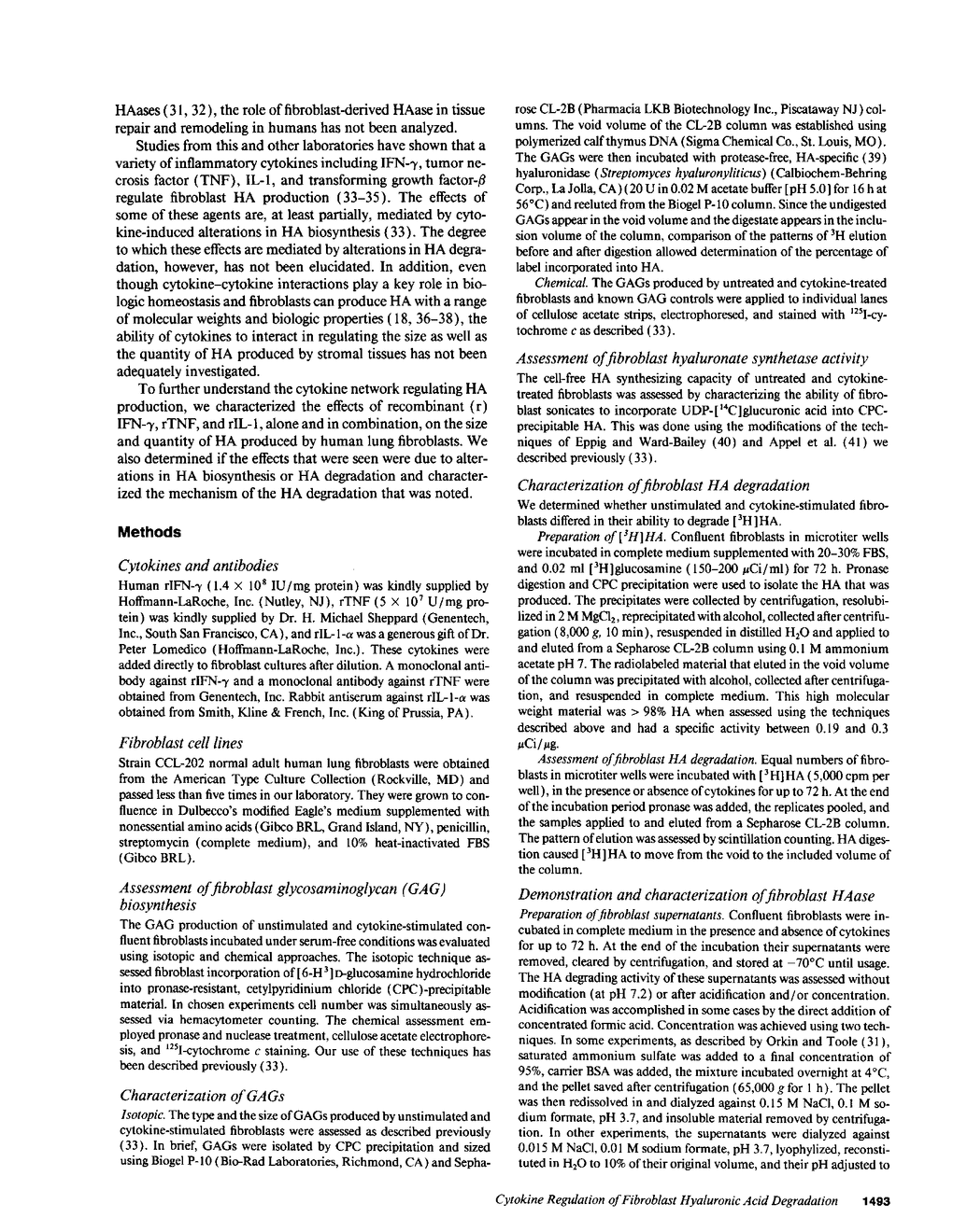 We characterized the mechanisms by which recombinant (r) tumor necrosis factor (TNF), IFN-gamma, and IL-1, alone and in combination, regulate human lung fibroblast hyaluronic acid (HA) production. Each cytokine stimulated fibroblast HA production. The combination of rTNF and rIFN-gamma resulted in a synergistic increase in the production of high molecular weight HA. This was due to a synergistic increase in hyaluronate synthetase activity and a simultaneous decrease in HA degradation. In contrast, when rTNF and rIL-1 were combined, an additive increase in low molecular weight HA was noted. This was due to a synergistic increase in hyaluronate synthetase activity and a simultaneous increase in HA degradation. Human lung fibroblasts contained a hyaluronidase that, at pH 3.7, depolymerized high molecular weight HA to 10-40 kD end products of digestion. However, hyaluronidase activity did not correlate with fibroblast HA degradation. Instead, HA degradation correlated with fibroblast-HA binding, which was increased by rIL-1 plus rTNF and decreased by rIFN-gamma plus rTNF. Recombinant IL-1 and rTNF weakly stimulated and rIL-1 and rTNF in combination further augmented the levels of CD44 mRNA in lung fibroblasts. In contrast, rIFN-gamma did not significantly alter the levels of CD44 mRNA in unstimulated or rTNF stimulated cells. These studies demonstrate that rIL-1, rTNF, and rIFN-gamma have complex effects on biosynthesis and degradation which alter the quantity and molecular weight of the HA produced by lung fibroblasts. They also show that fibroblast HA degradation is mediated by a previously unrecognized lysosomal-type hyaluronidase whose function may be regulated by altering fibroblast-HA binding. Lastly, they suggest that the CD44 HA receptor may be involved in this process.